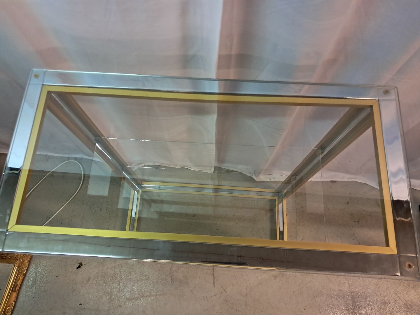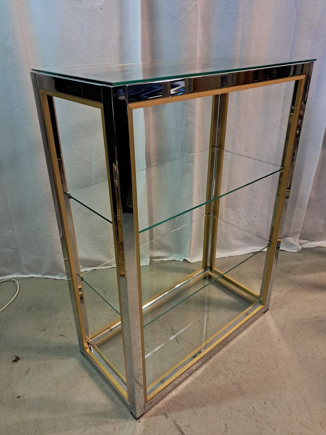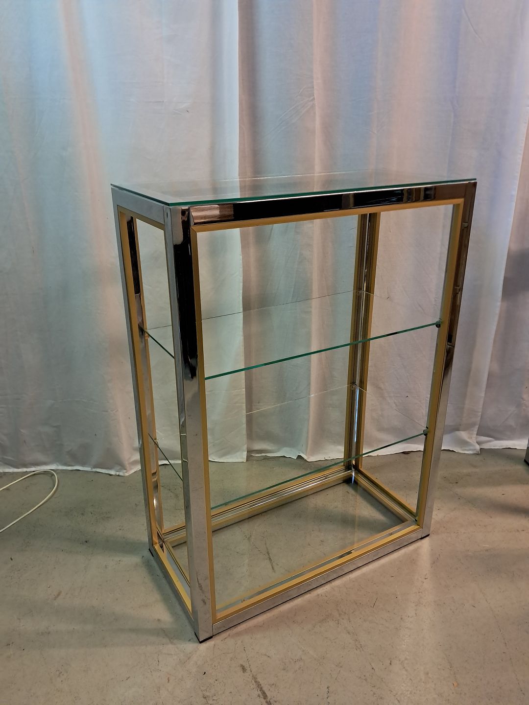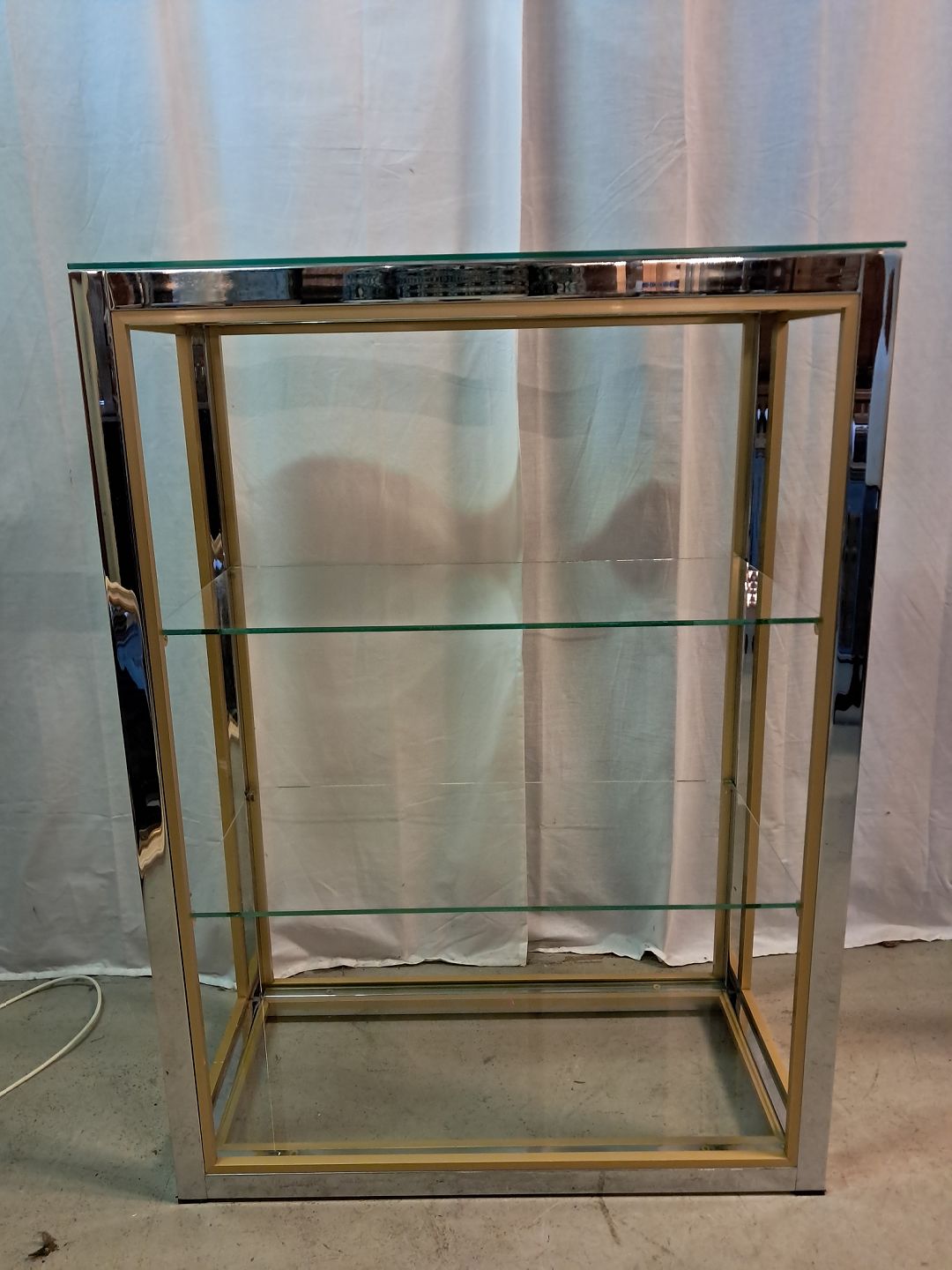 Forkromet reol i metal med glashylder, fra 1980erne.Den har brugsspor.