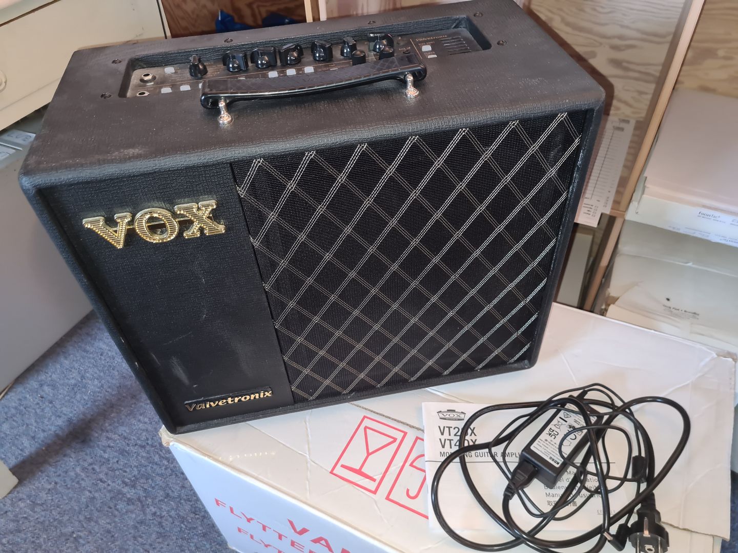 VOX Guitarforstærker model VT40X. Testet og virker. Uden synlige brugsspor. Manual og strømforsyning medfølger. Højde 38 cm. Bredde 46 cm. Dybde 23 cm.