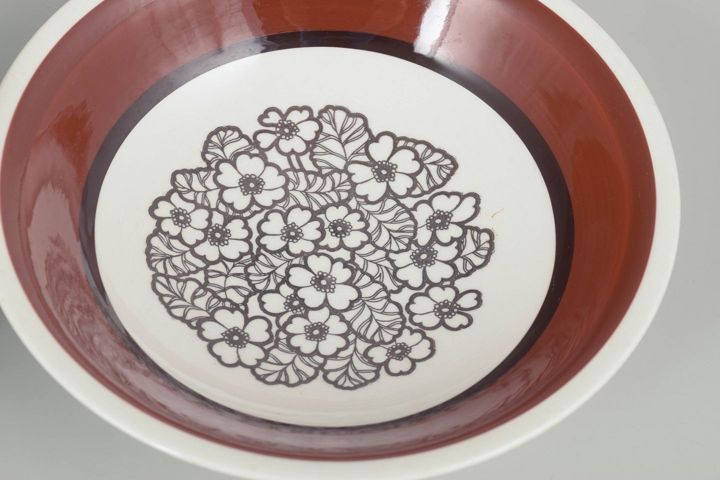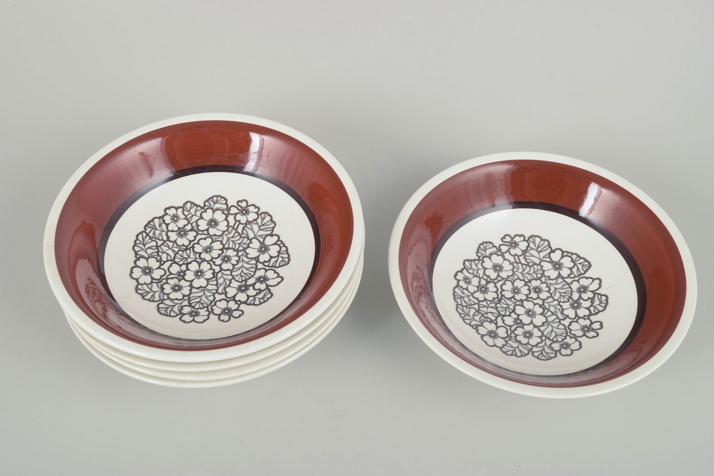 Gefle “Agneta” fem dybe tallerkener, 1970’erne.Sæt på 5 dybe stentøjstallerkener med den ikoniske Agneta-dekoration: et grafisk blomsterfelt i sorte linjer, indrammet af den varme rødbrune kant, som kendetegner serien. Velegnet som suppe- eller pastatallerkener.