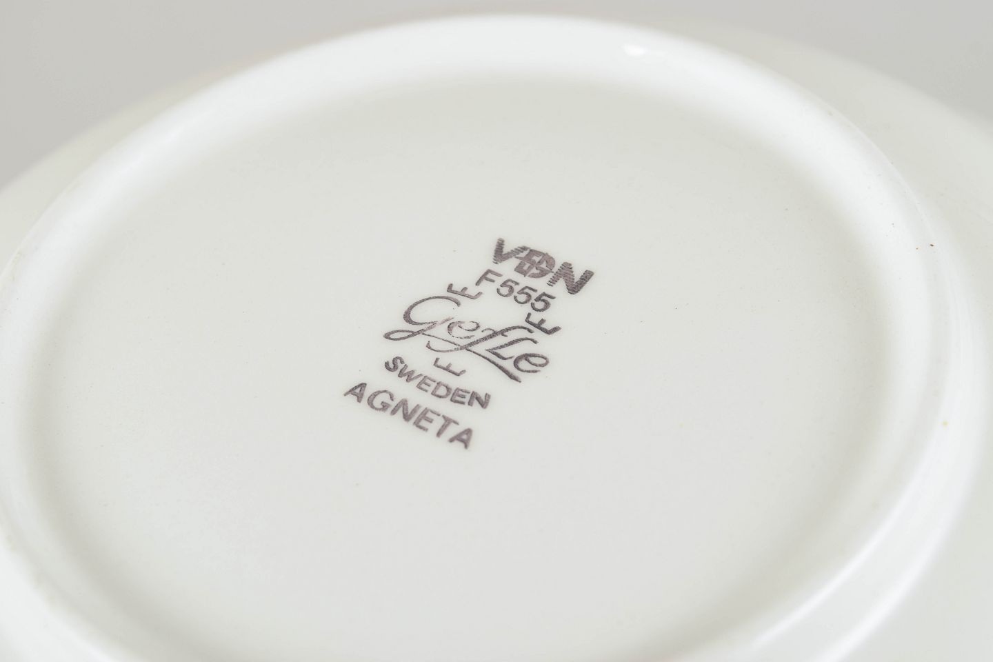 Gefle (Gefle Porslinsfabrik), grundlagt i 1910 og senere en del af Upsala Ekeby, var kendt for sine markante dekorer og varme farvepaletter i 60’erne og 70’erne. Agneta-serien er i dag et eftertragtet retrostel, værdsat for sit tidstypiske grafiske udtryk.