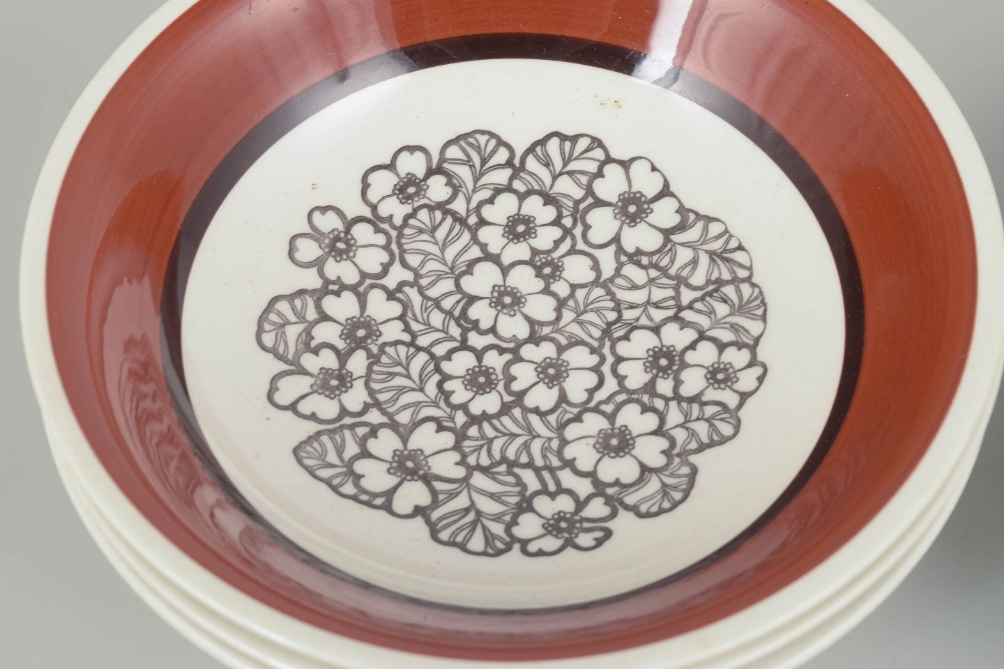 Gefle “Agneta” Sæt på 4 dybe stentøjstallerkener med den klassiske Agneta-dekoration: et centralt grafisk blomsterfelt i sorte linjer, omgivet af den varme rødbrune kant, karakteristisk for serien. Ideelle som suppetallerkener eller pastaskåle.