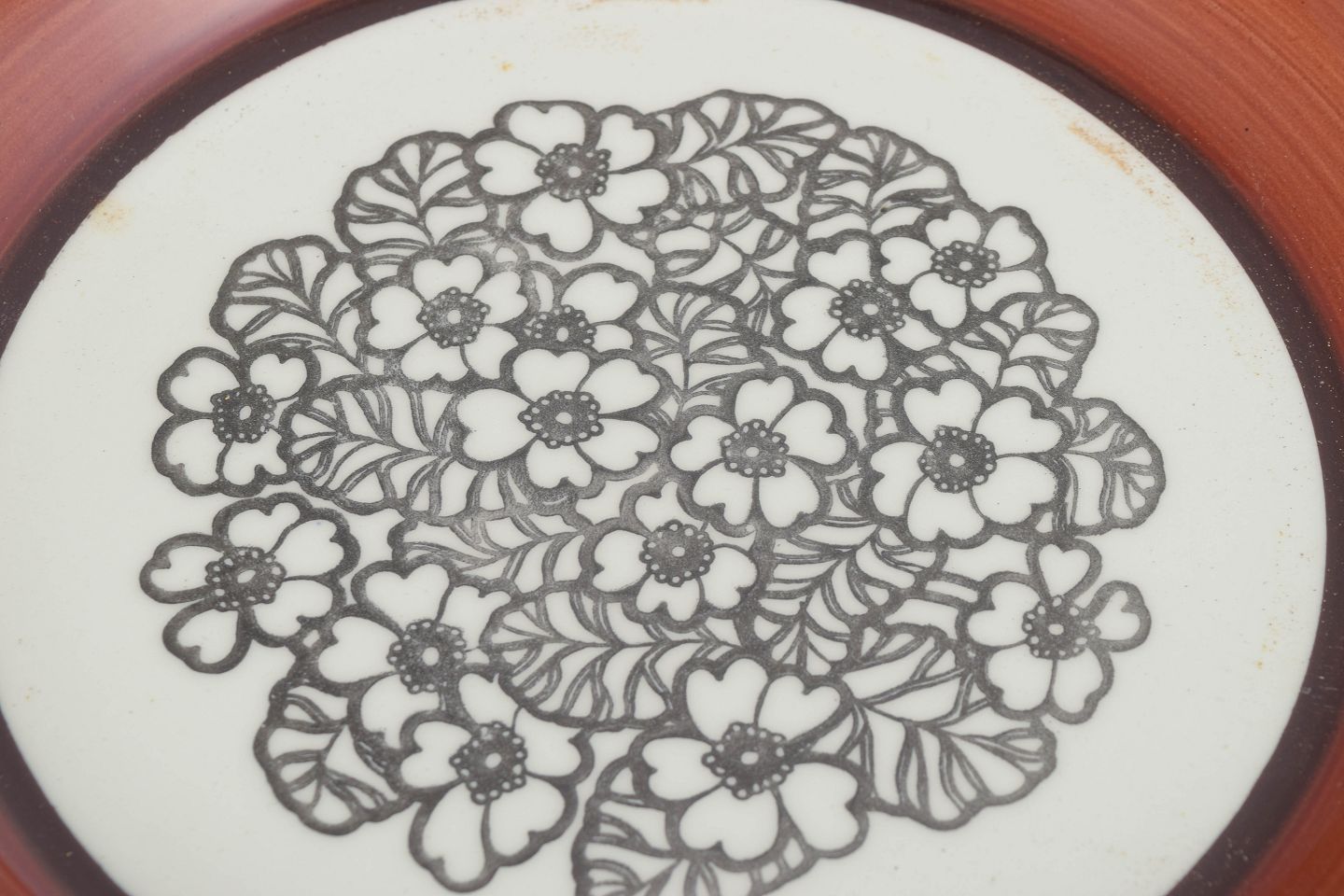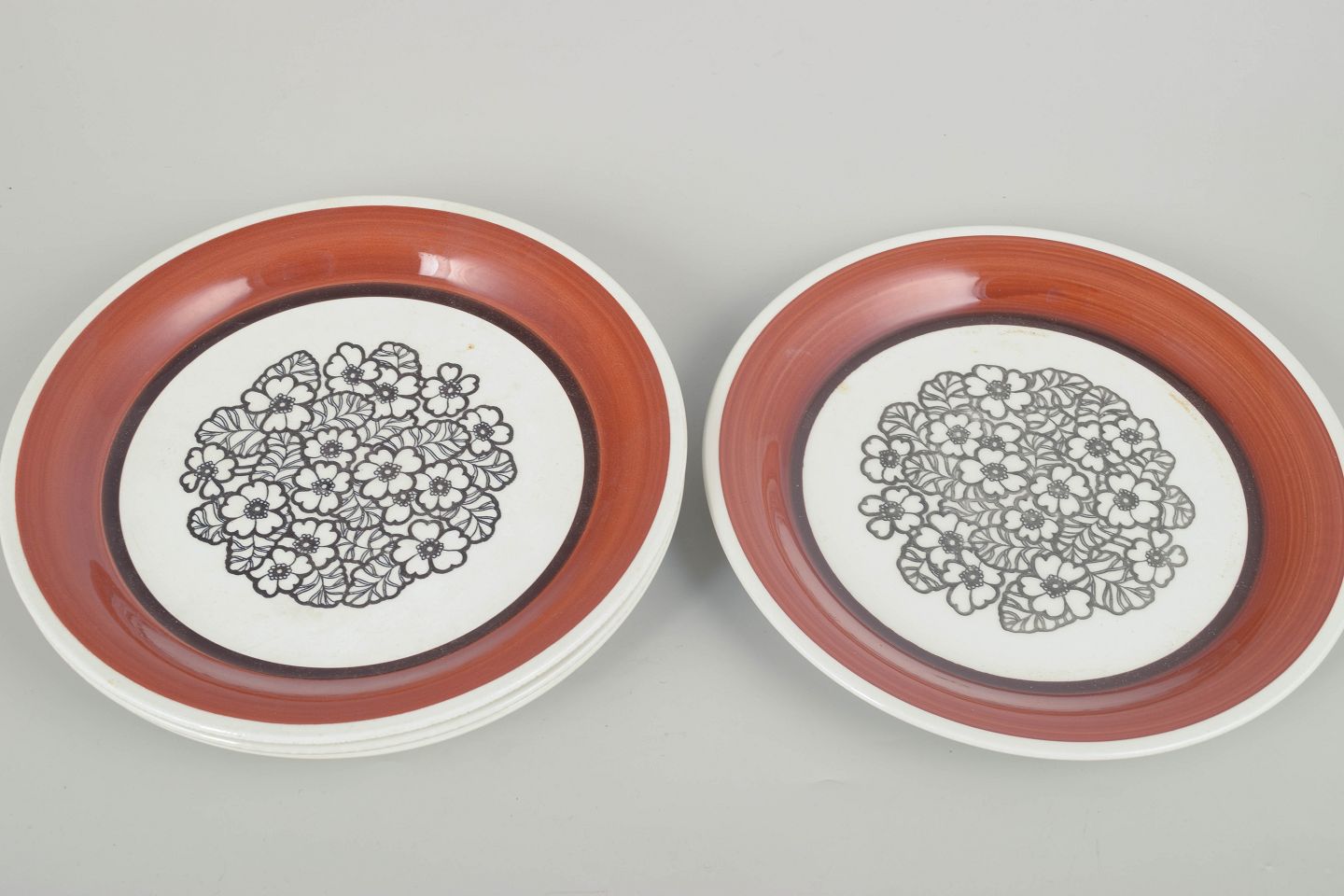 Gefle “Agneta” 4 middagstallerkener, 1970’erne.Sæt på 4 store stentøjstallerkener med den karakteristiske Agneta-dekoration: et grafisk blomsterfelt i sorte linjer omgivet af en varm rødbrun kant. Et klassisk 70’er-design fra Gefle med et både dekorativt og funktionelt udtryk.