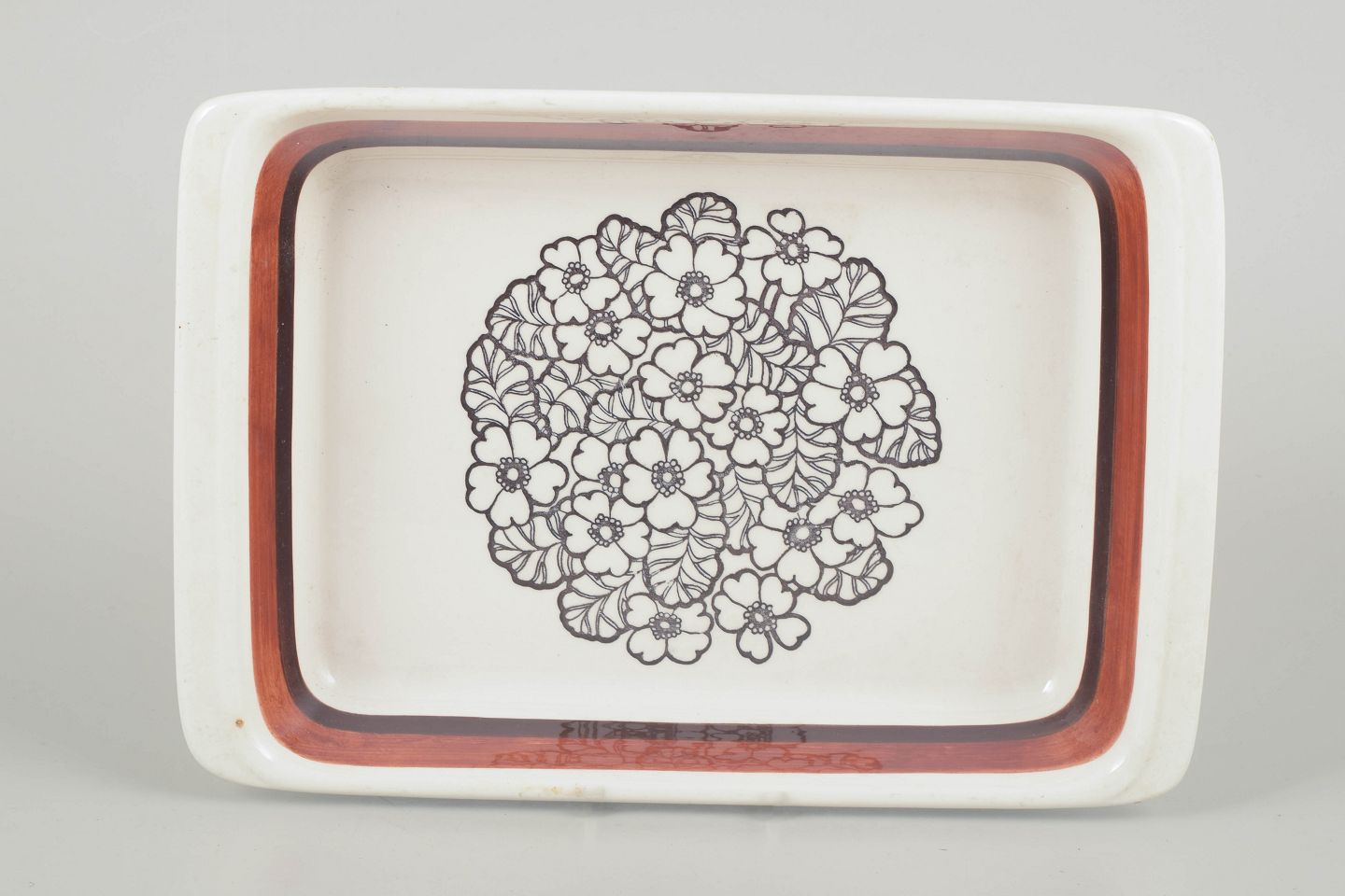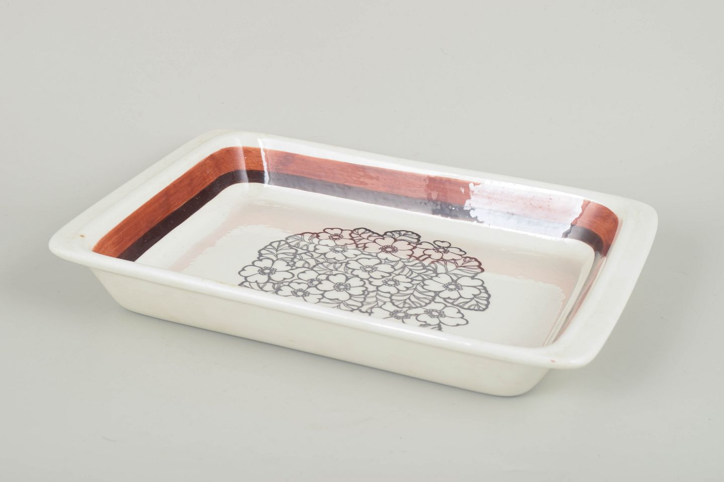 Gefle “Agneta” Fad, 1970’erne.Rektangulært stentøjsfad med karakteristisk blomsterdekoration i brunlige og sorte toner, typisk for Gefles dekorative 70’er-udtryk.