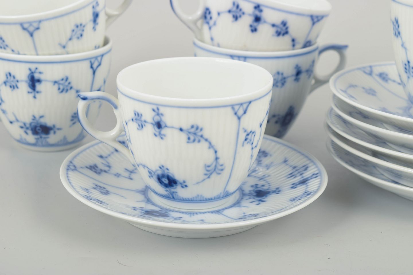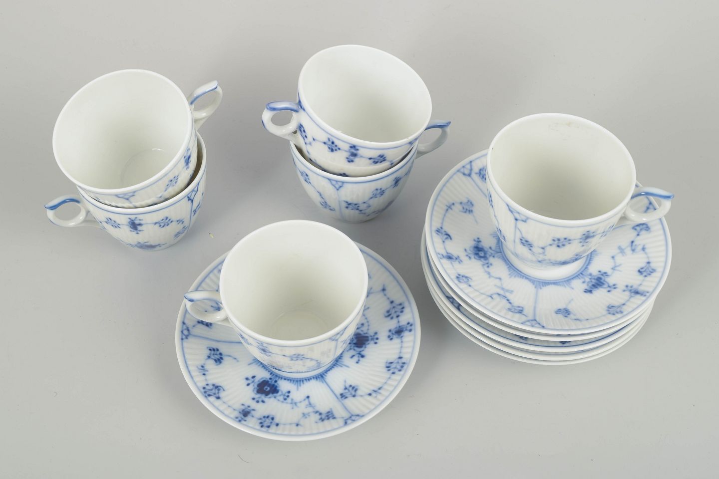 Royal CopenhagenSæt bestående af seks kaffekopper med tilhørende underkopper i det klassiske Musselmalet Riflet-mønster.
