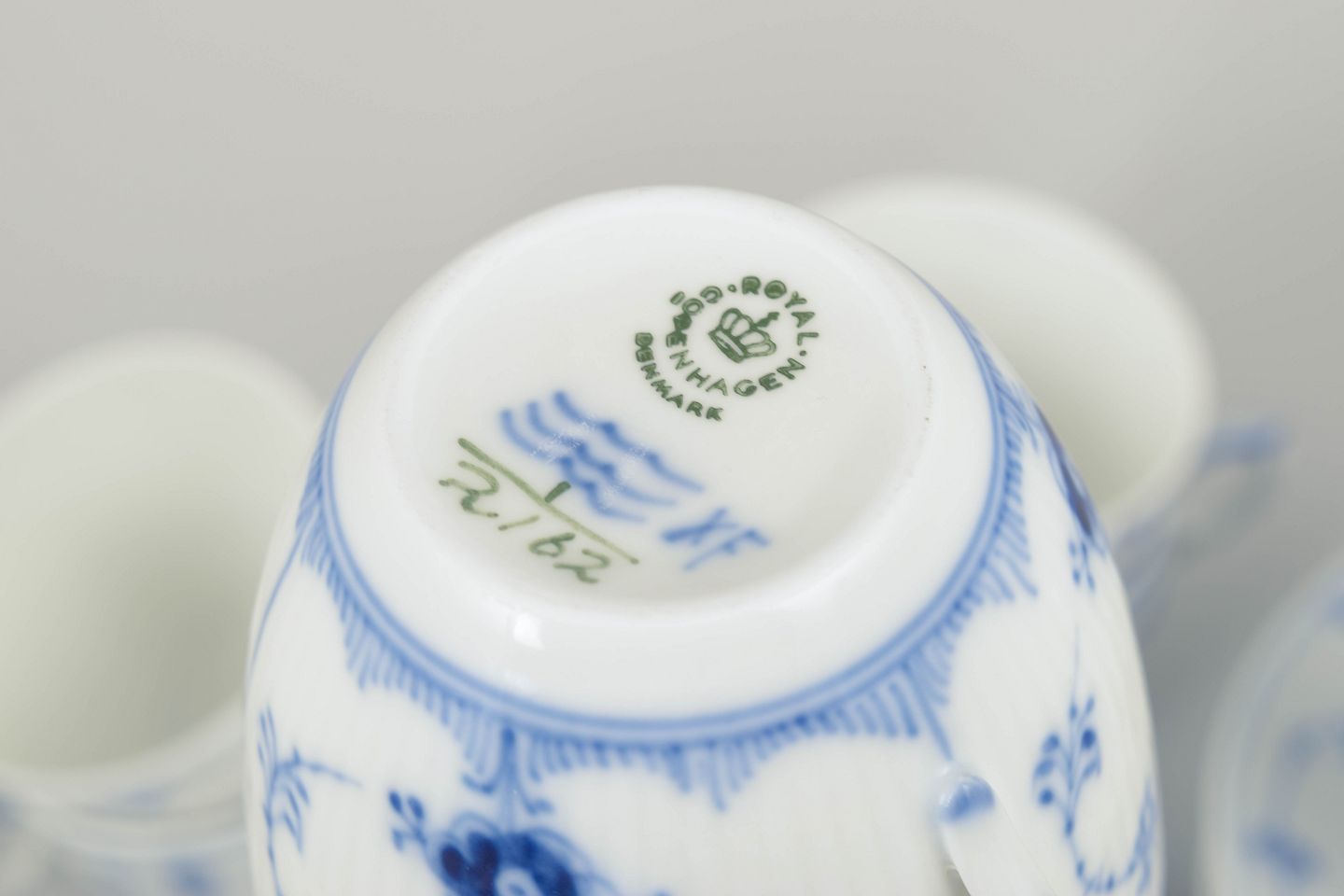 Royal CopenhagenSæt bestående af seks kaffekopper med tilhørende underkopper i det klassiske Musselmalet Riflet-mønster, model 1/2162.