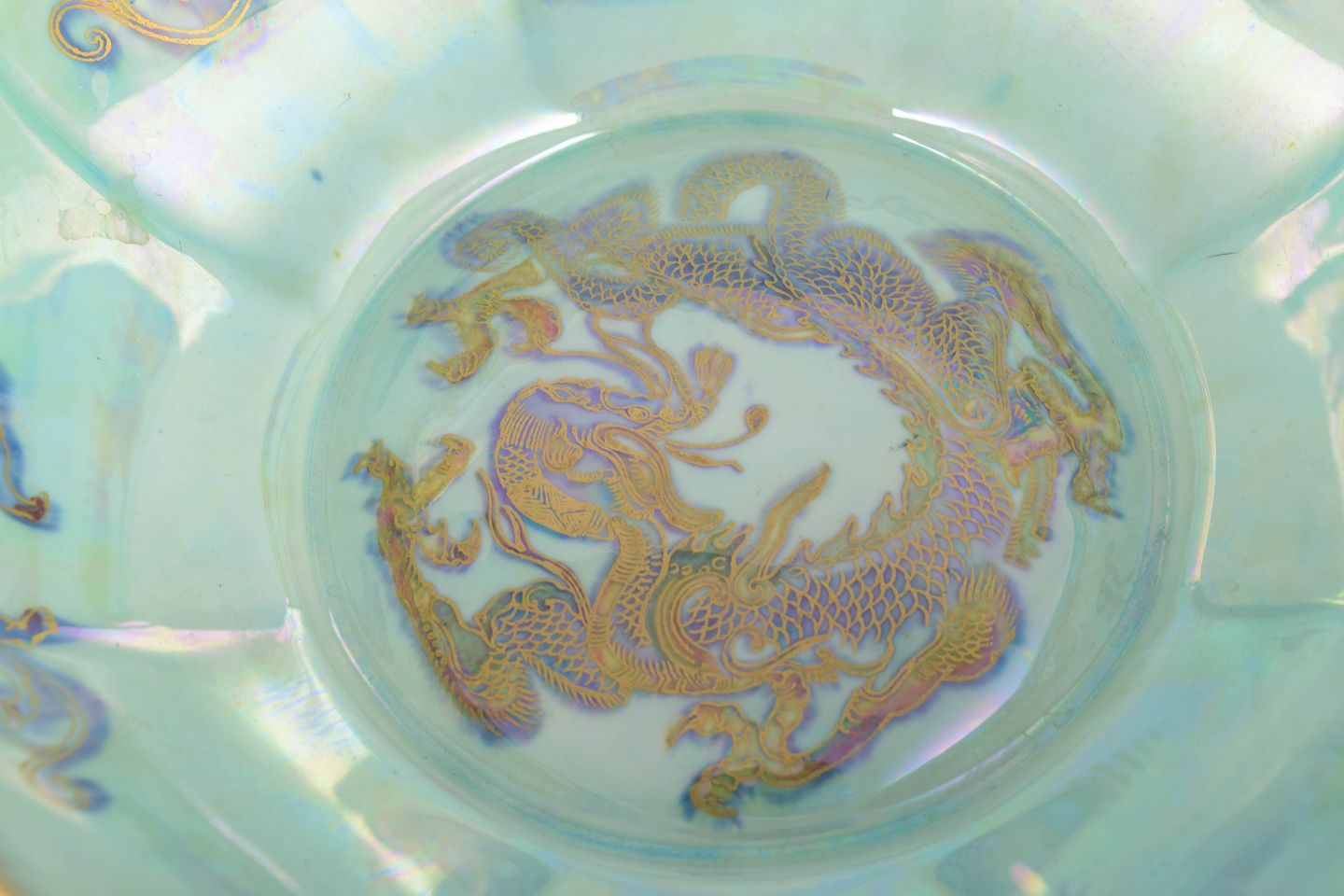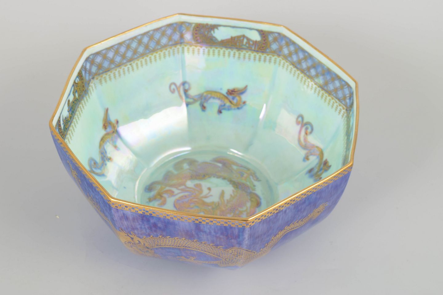 Stor, ottekantet Fairyland Lustre-skål i intense blå-violette nuancer med håndmalet gulddrage og iriserende indre. Et ikonisk eksempel på Makeig-Jones’ fantasifulde og luksuriøse porcelæn.