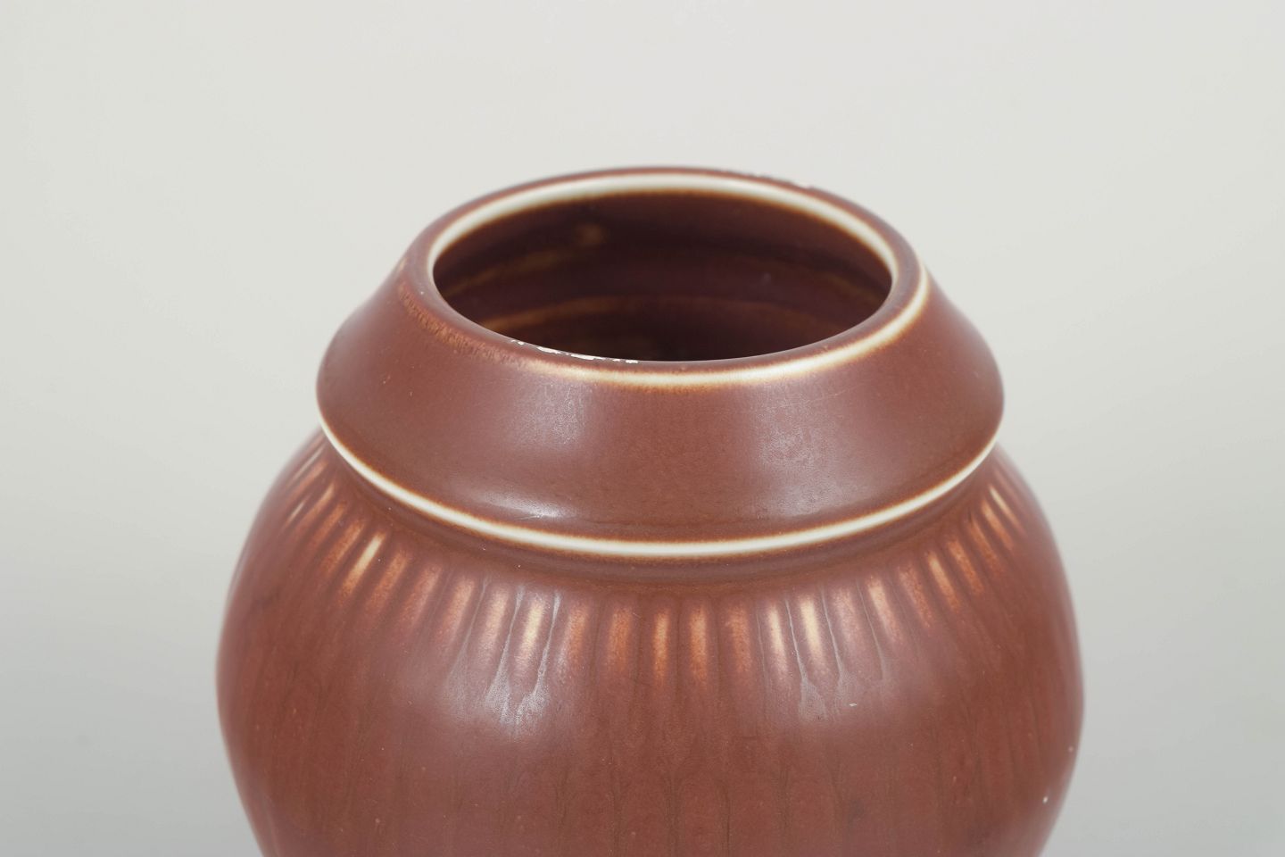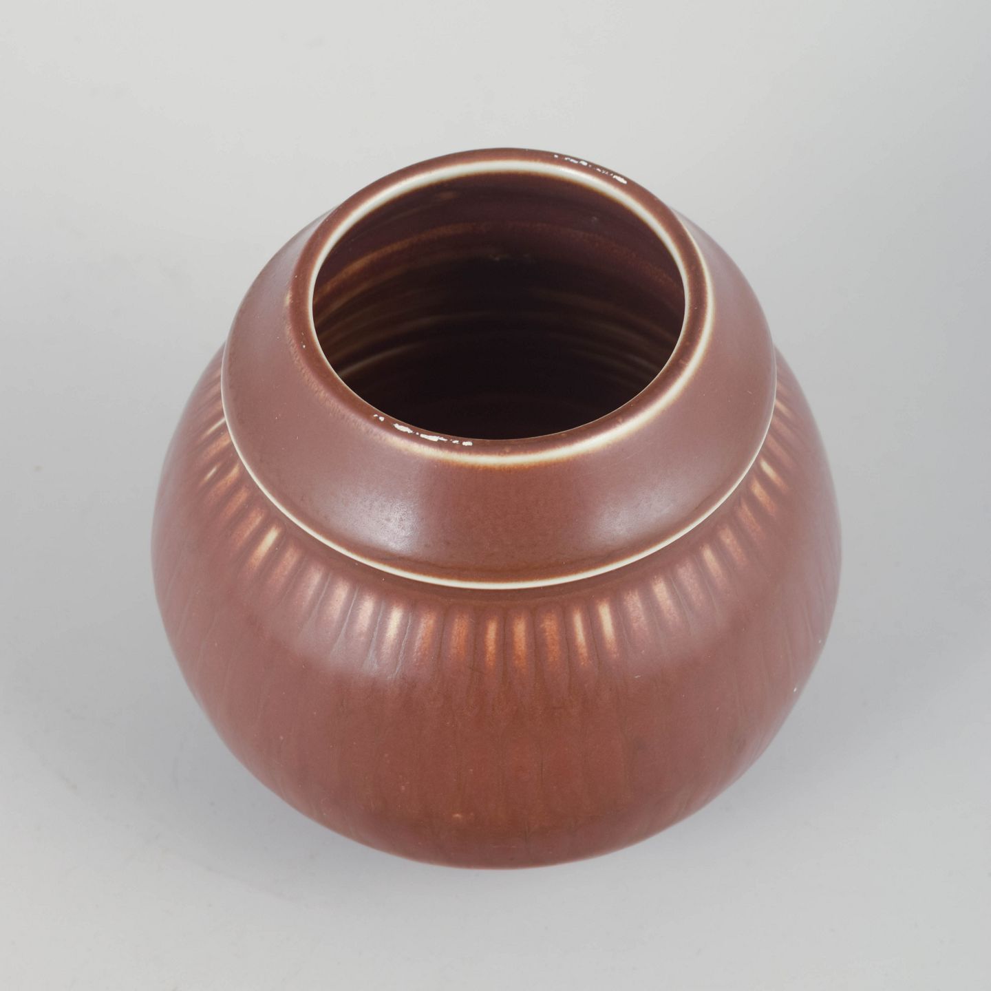 Kugleformet vase i glaseret stentøj med diskrete lodrette rifler og en blød overgang mod den let udsvajede hals. Den varme brunlige glasur med lyse nuancer langs kanten giver et klassisk Rörstrand-udtryk fra perioden.