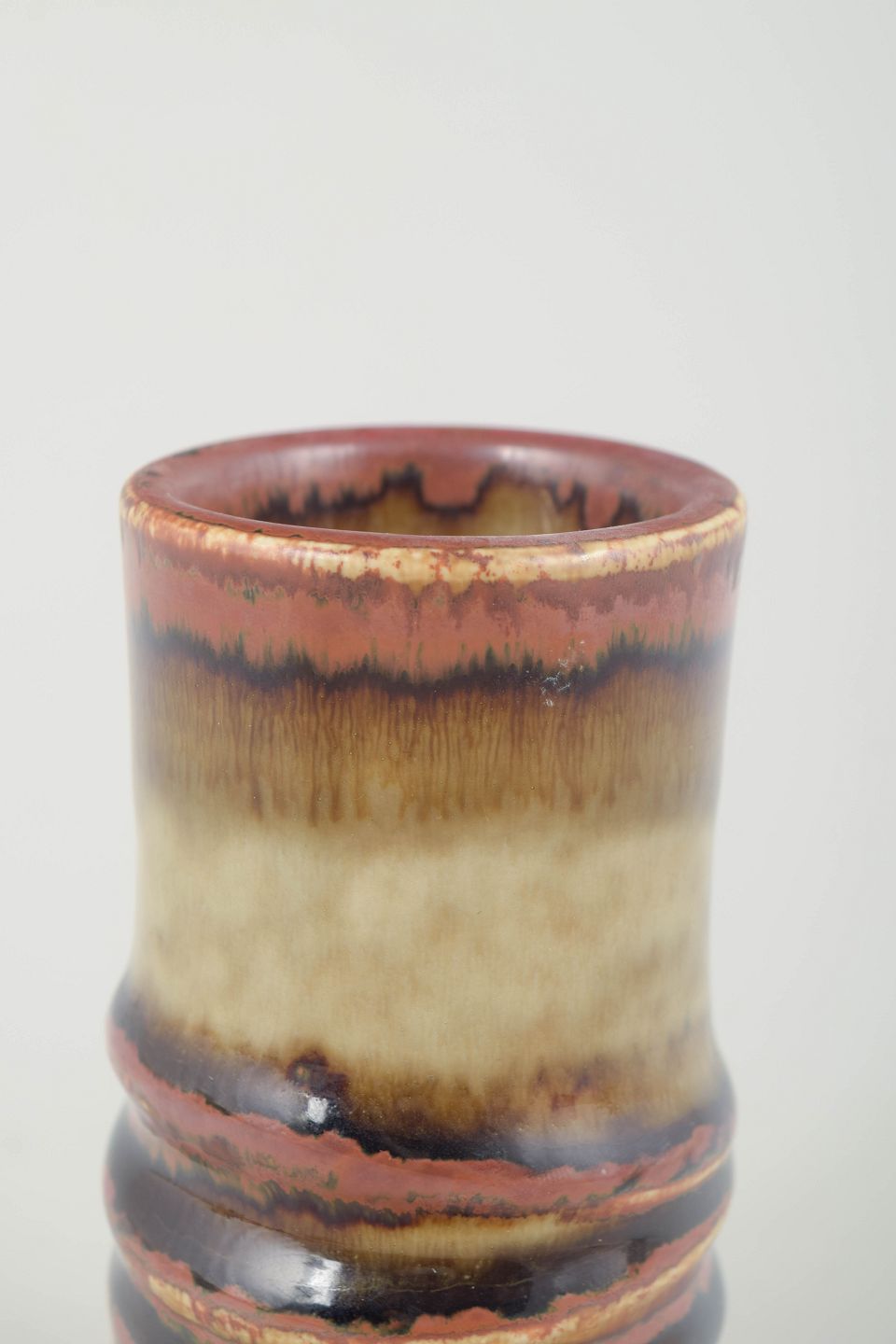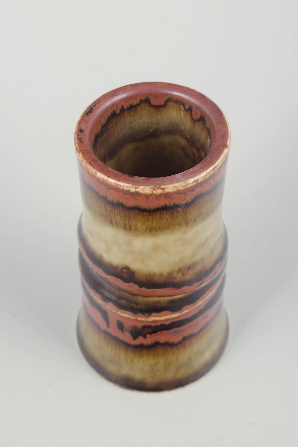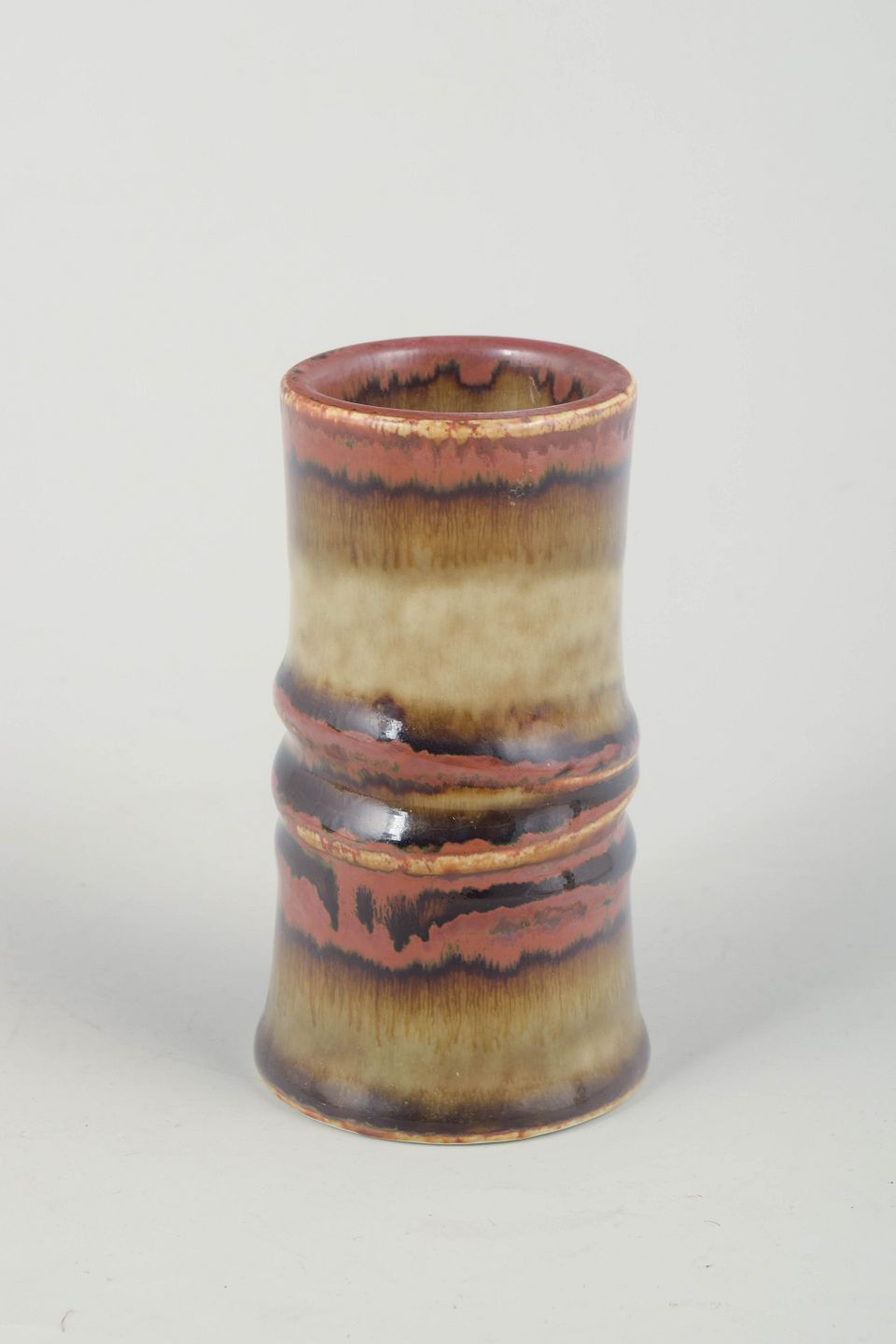 Cylindrisk vase i glaseret stentøj med markeret midterprofil og en smukt løbende flerfarvet glasur i rødlige, brune og beige nuancer – et karakteristisk udtryk for Olle Anderssons organiske formsprog.