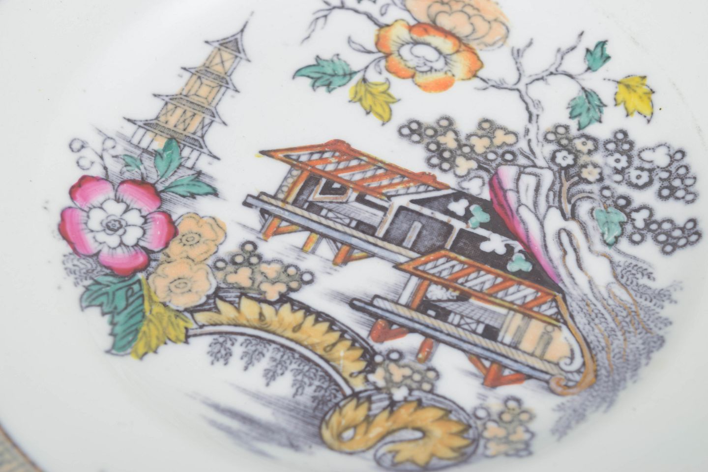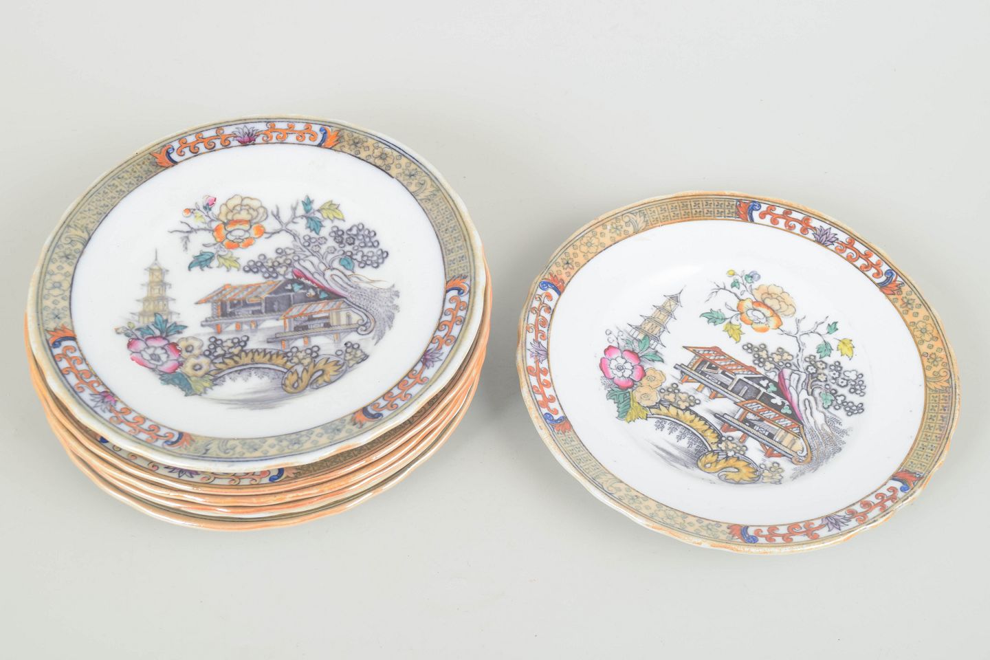 Dekorative fajancetallerkener med den klassiske “Japan”-dekor, håndmalet i flerfarvet palet med orientalsk inspirerede motiver. Let gulfarvning efter alder.