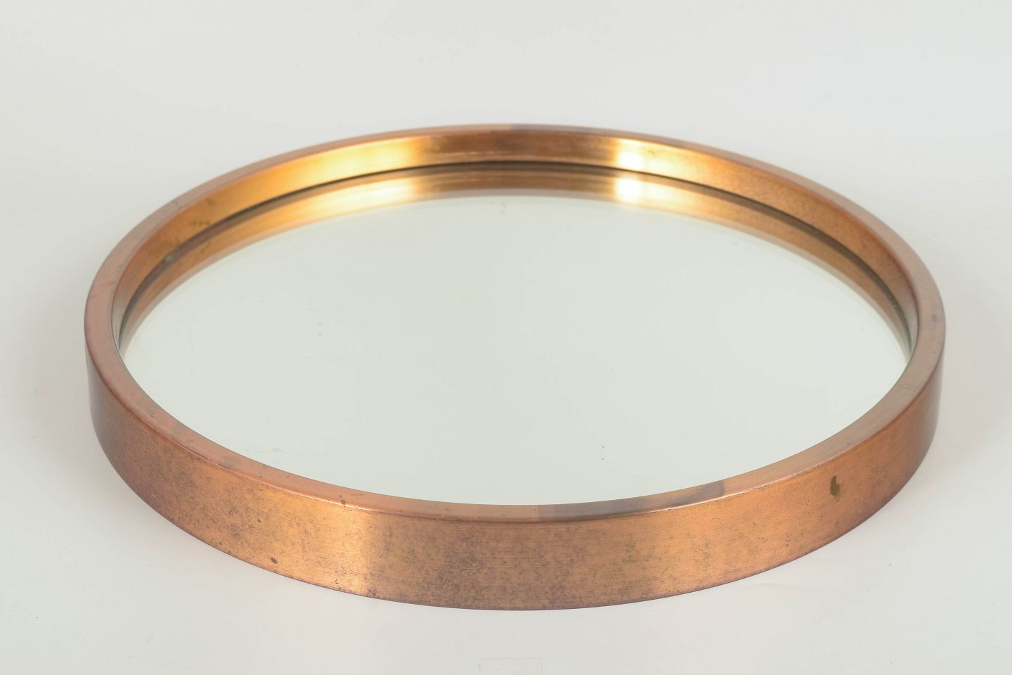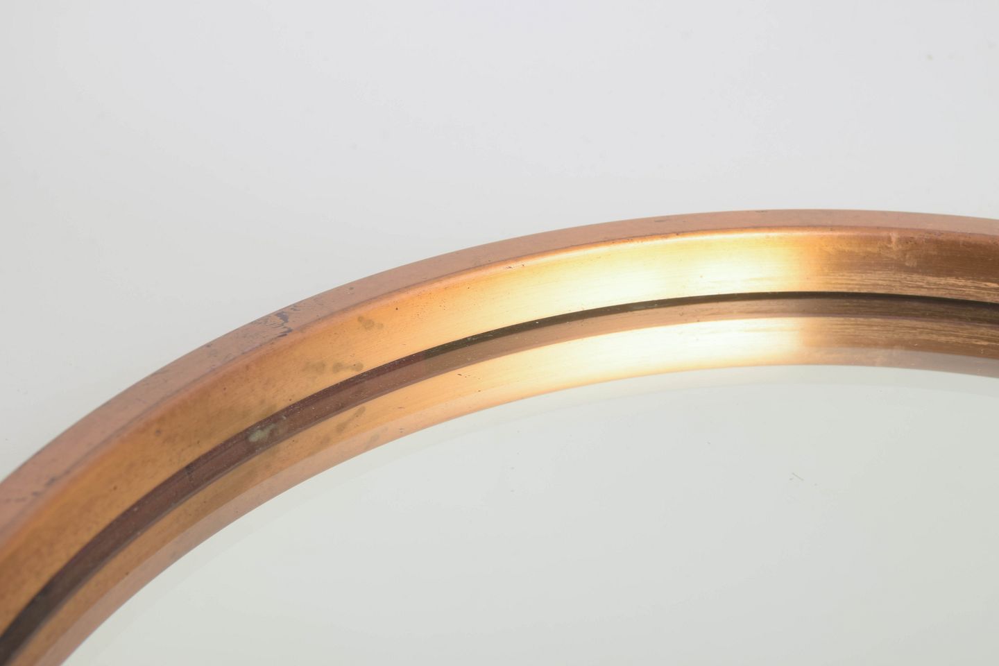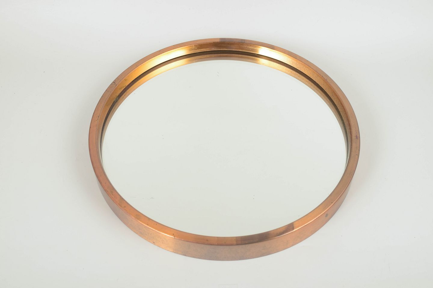 Elegant, rundt designer-spejl med massiv messingramme og krystalklart spejlglas. Den enkle, moderne form er typisk for 1970’ernes skandinaviske boligdesign, hvor kvalitetsmaterialer og rene linjer dominerede.