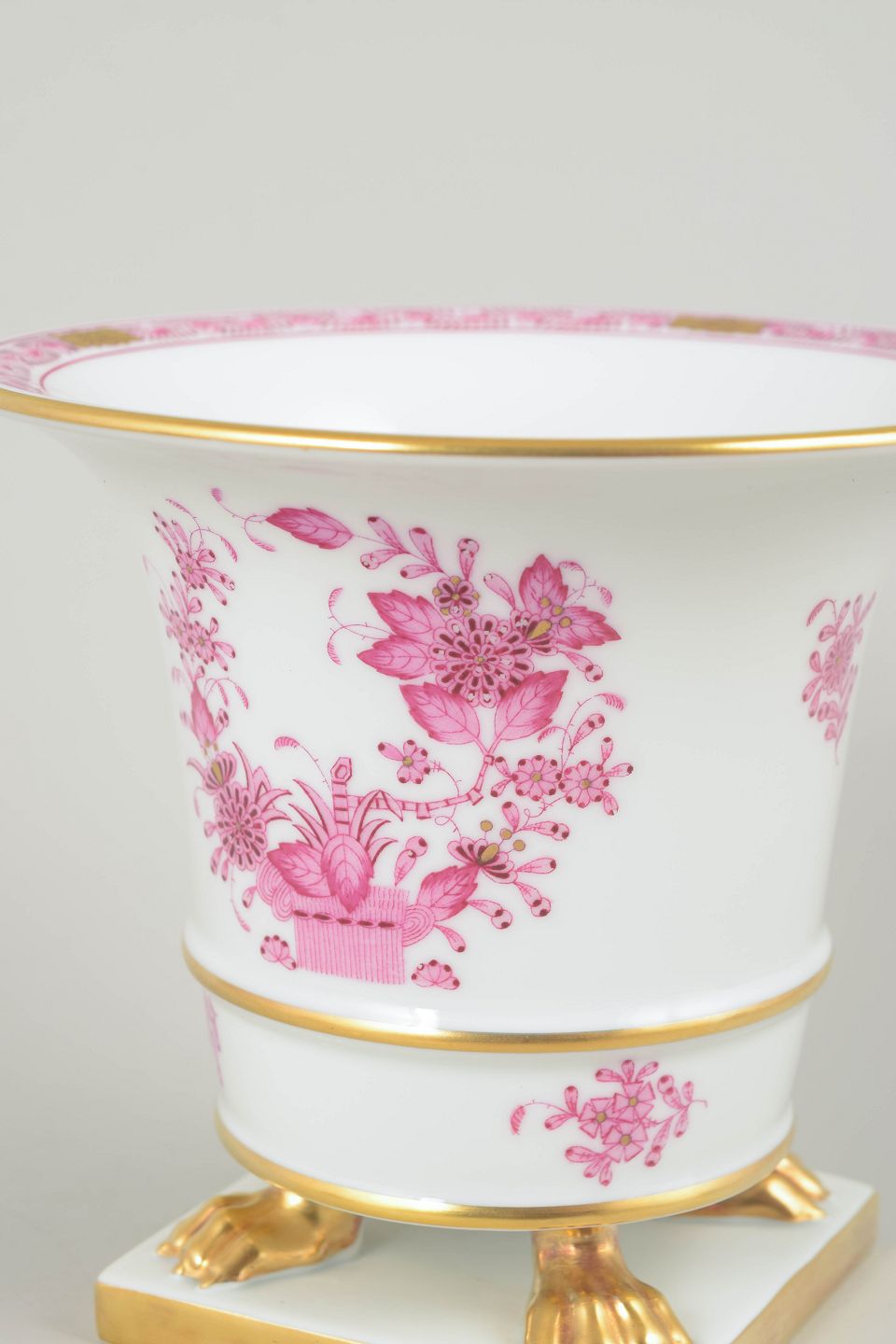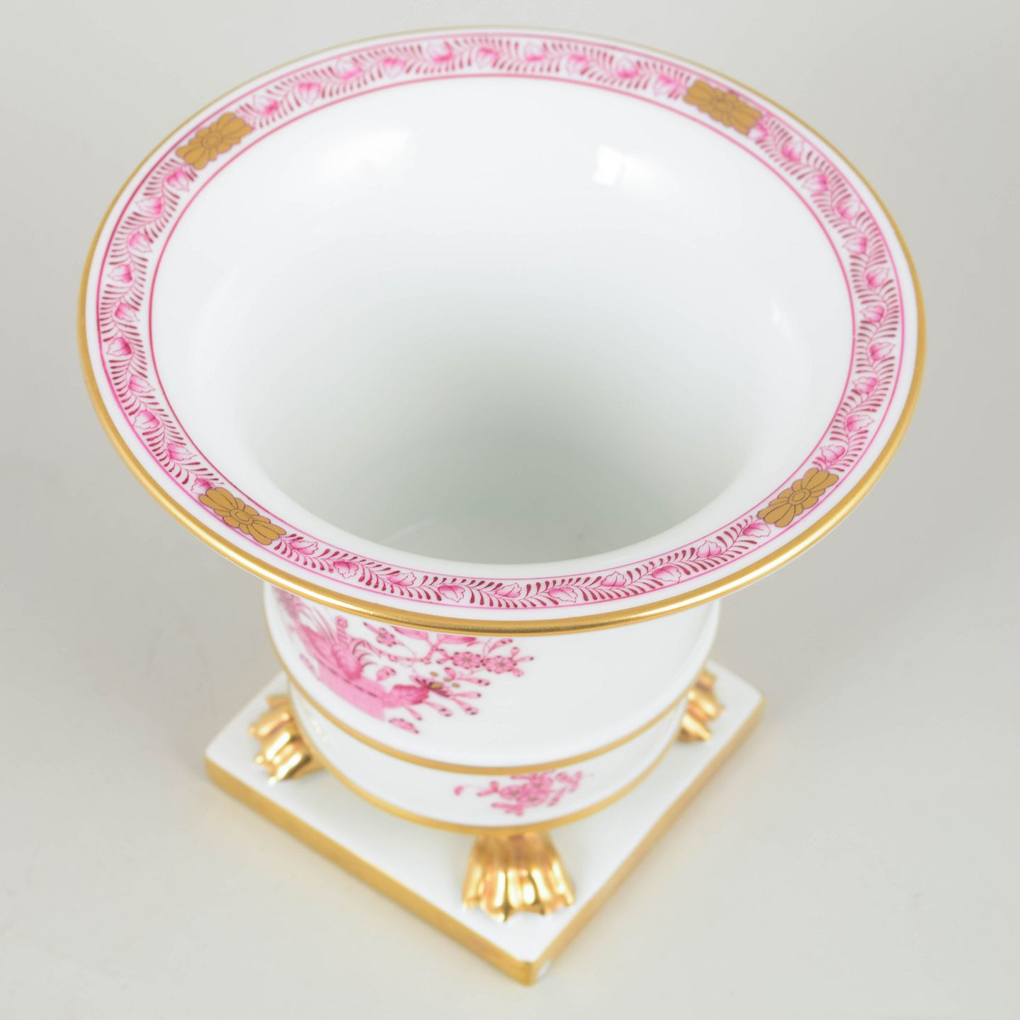 Elegant porcelænskrukke fra Herend i hvid porcelæn med håndmalet pink “Indian Basket”-dekoration og forgyldte detaljer. Formen er klassisk og opadsvungen, afsluttet med klørfødder og kvadratisk sokkel.