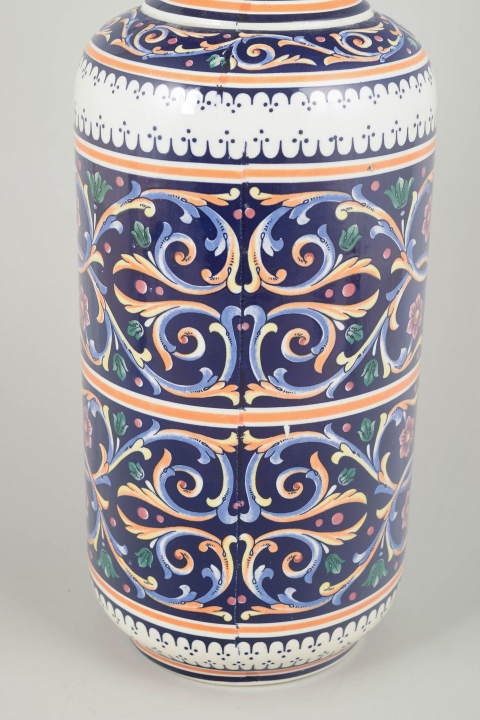 Dekorativ italiensk majolicavase udsmykket med decalcomania-overførselsteknik, hvor det farverige ornamentale motiv og portrætmedaljon er påført som transfertryk i klassisk majolica-stil.