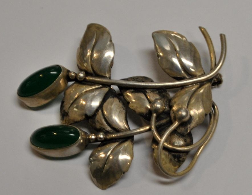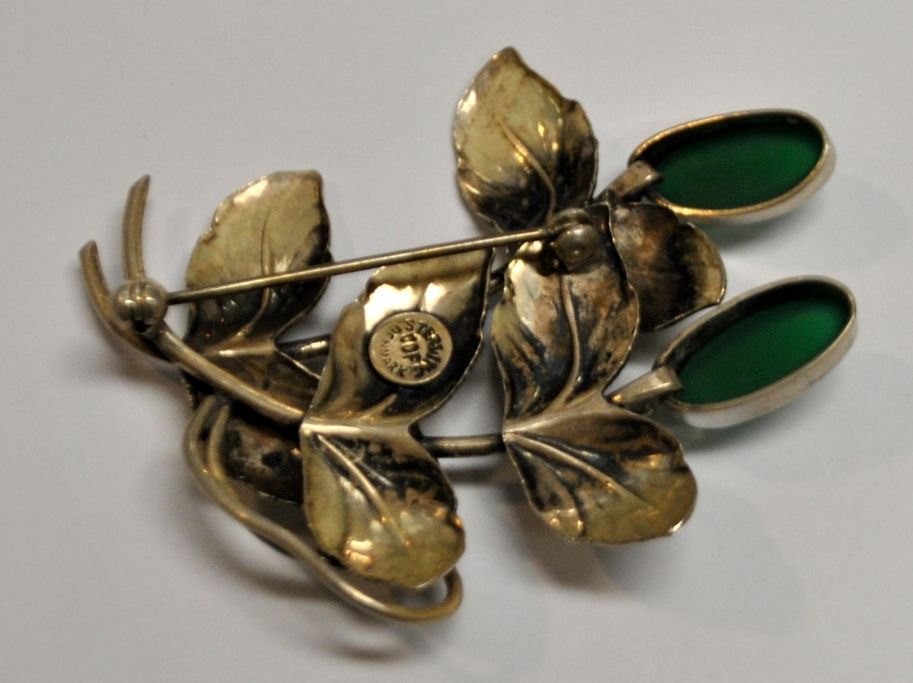 Karin Borup, Kopenhagen – Birkerød (2010 – ): Brosche aus Sterlingsilber. Mit zwei grünen Steinen. Gestempelt: COP. 6 x 5 cm.Bestellnummer: 28714