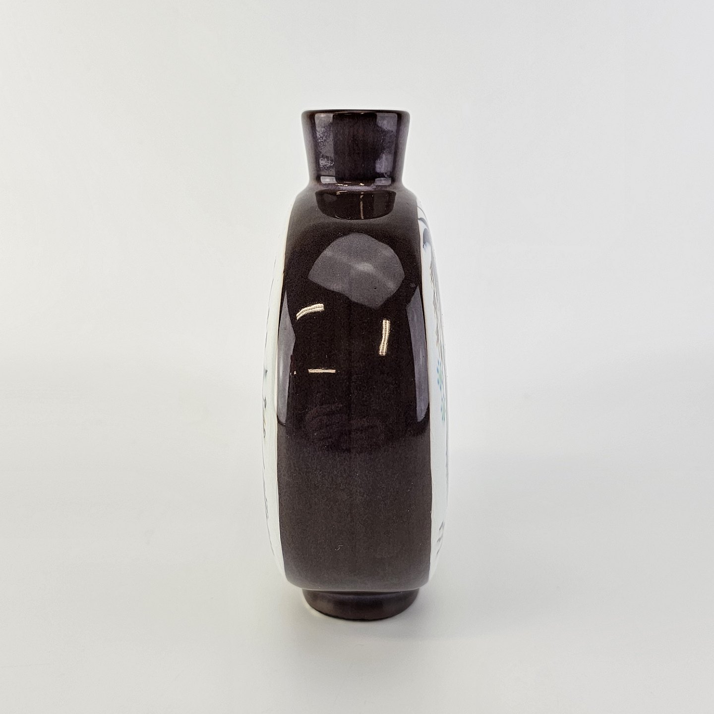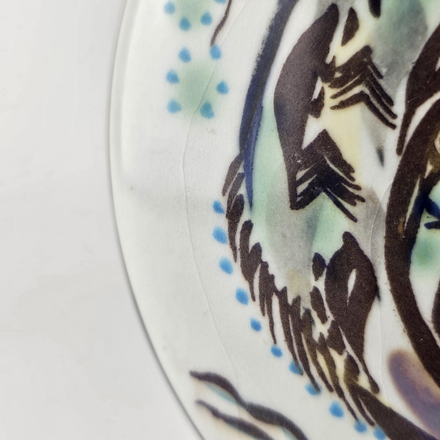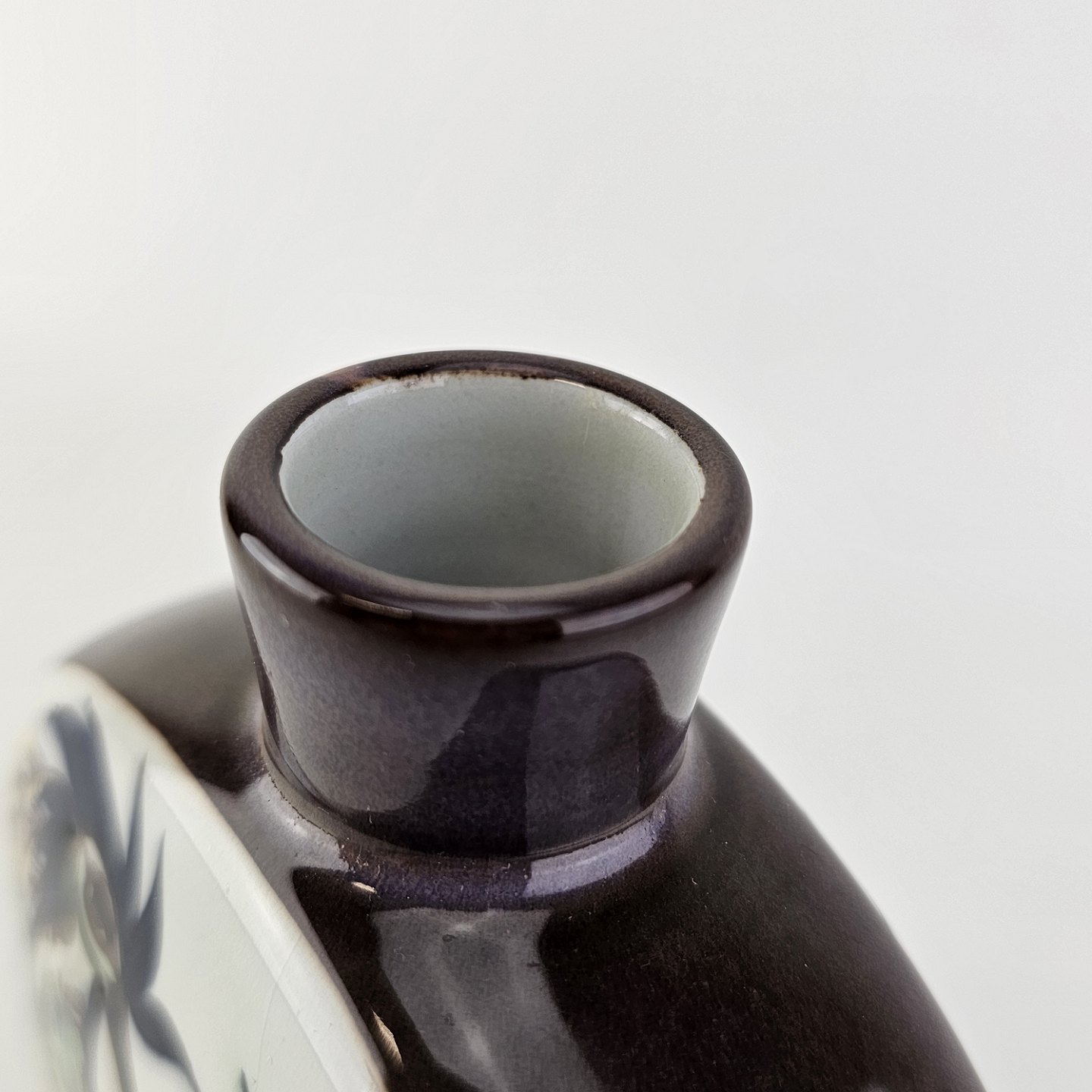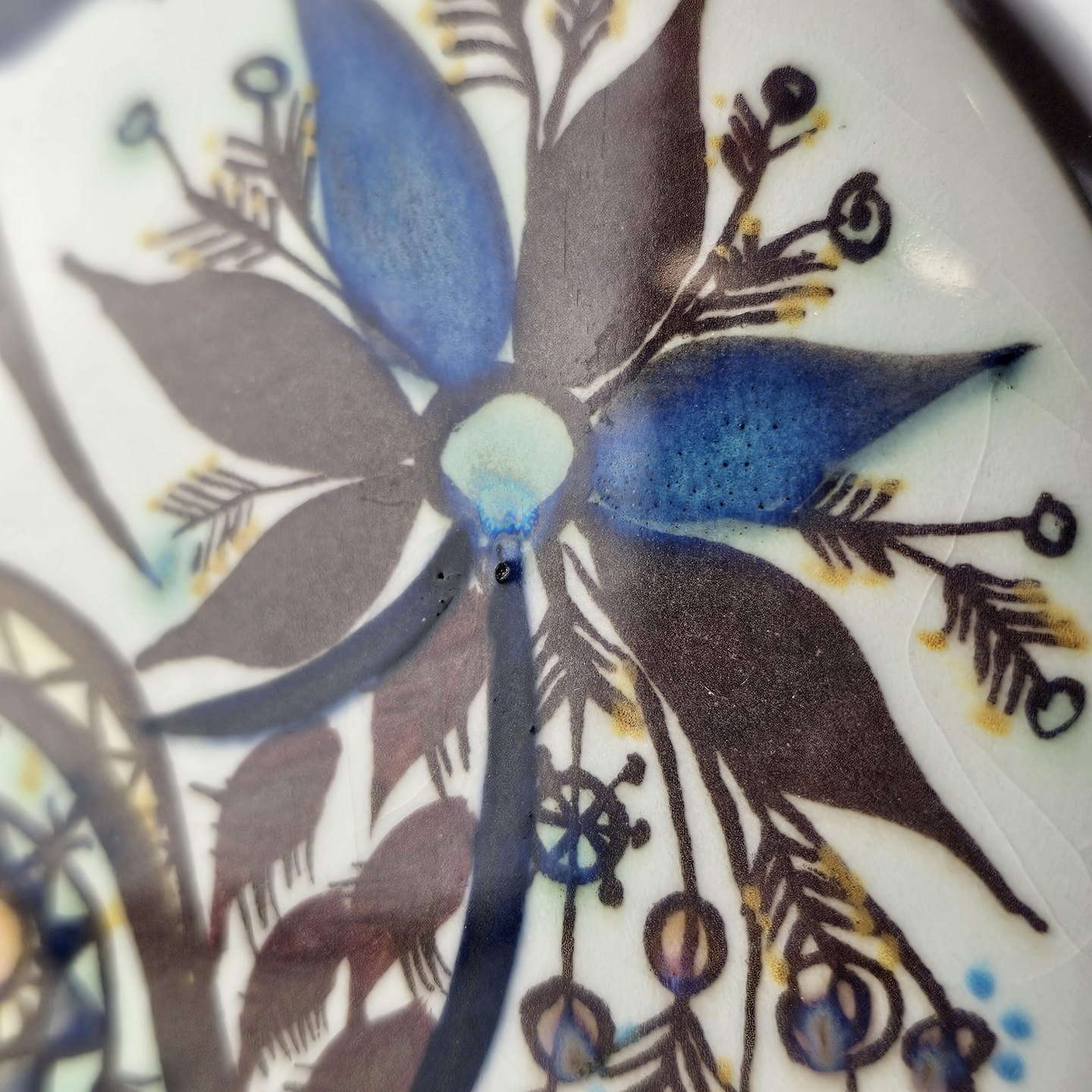 Rund flad vase fra serien Tenera. Vasen er i fajance med motiv af en fuglNr. 217/3102