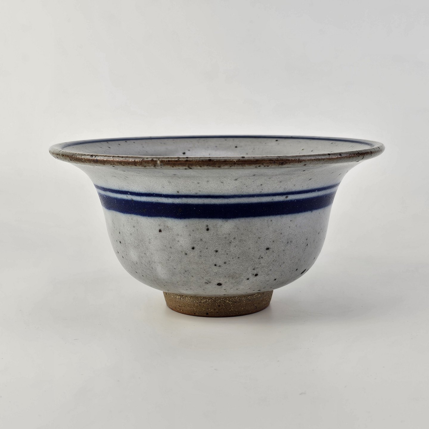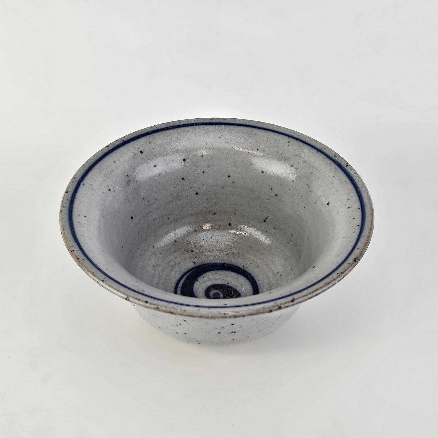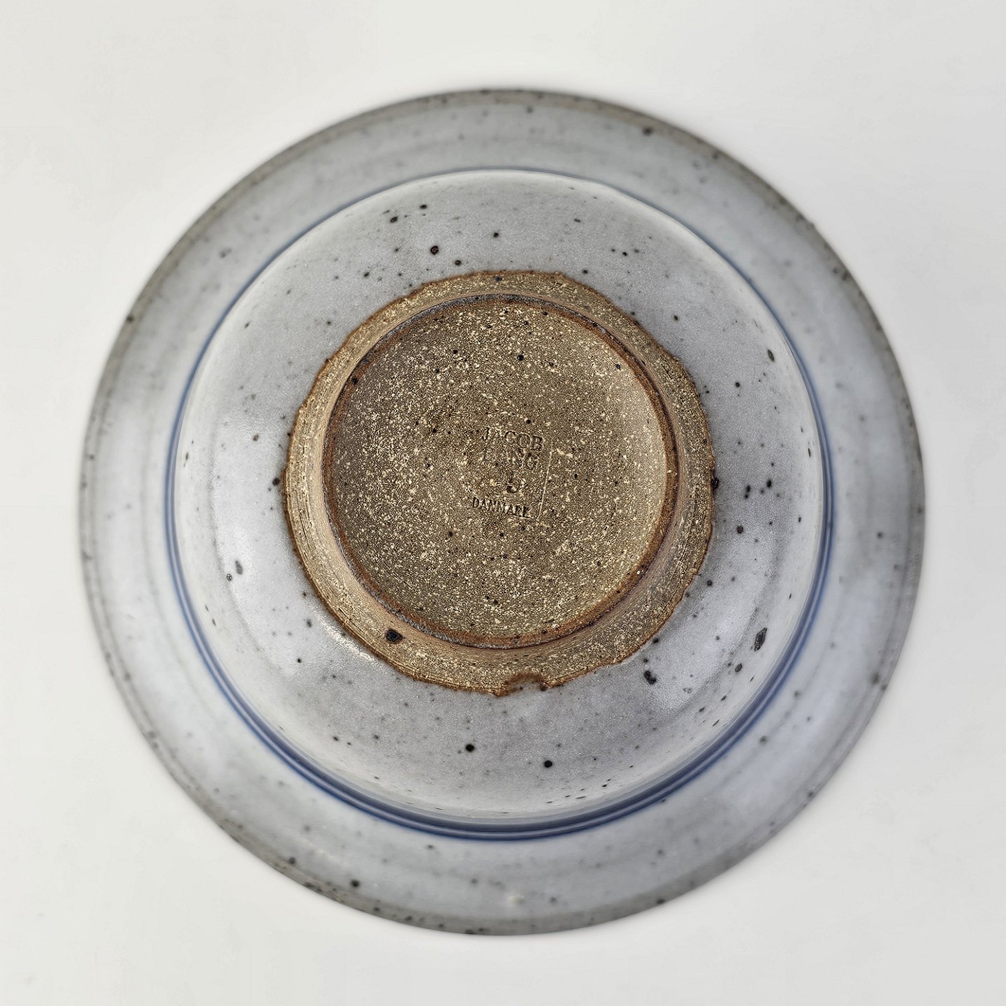Skål i glaseret stentøj i hvide nuancer med dekoration af blå striber og en blå hvirvel i bunden54