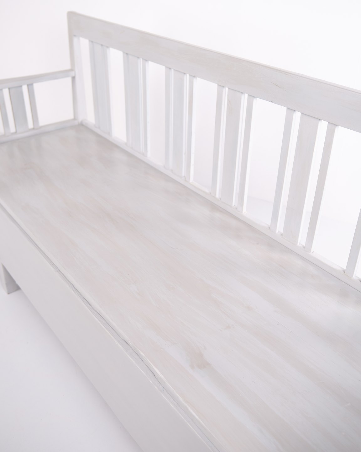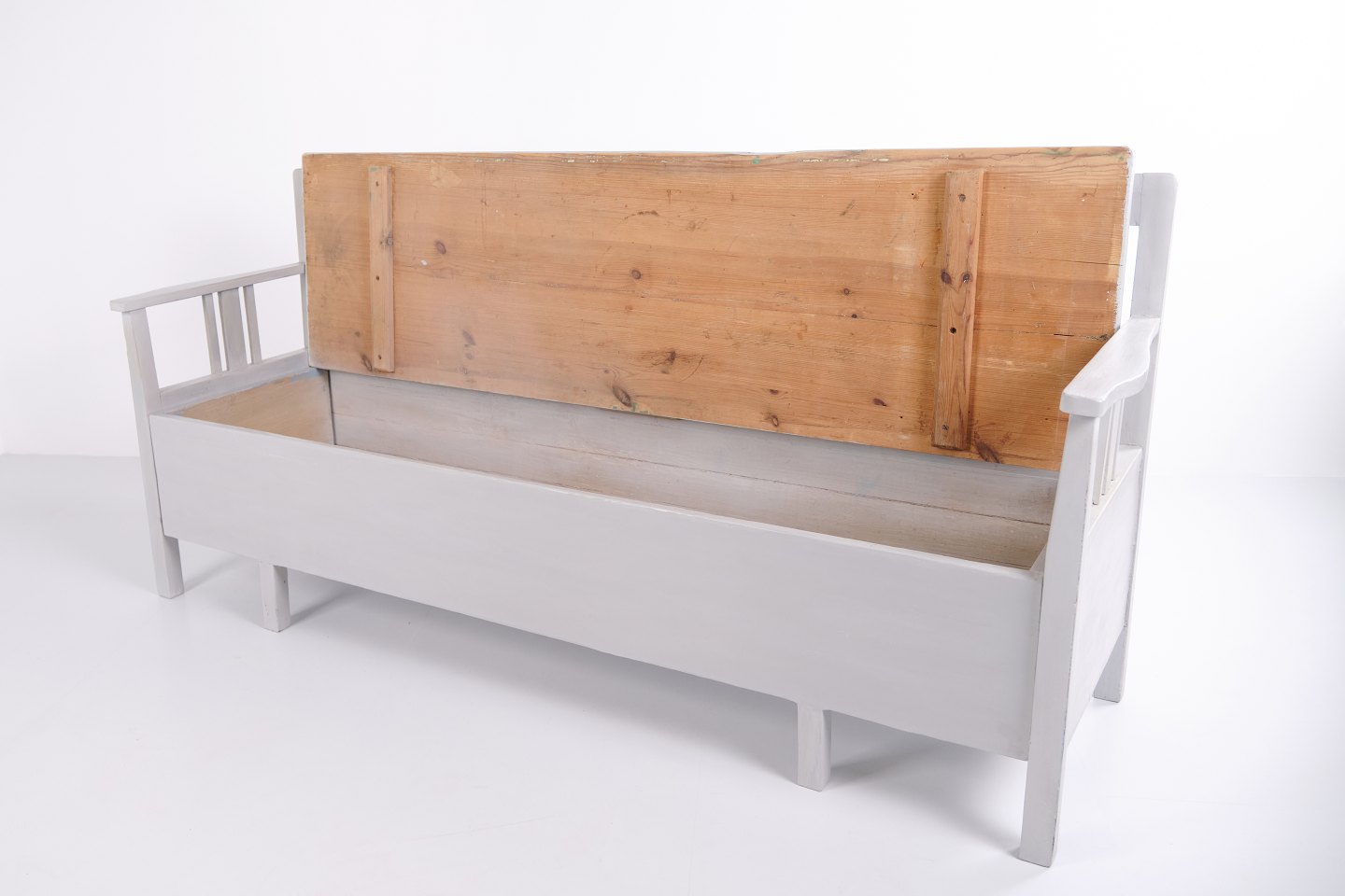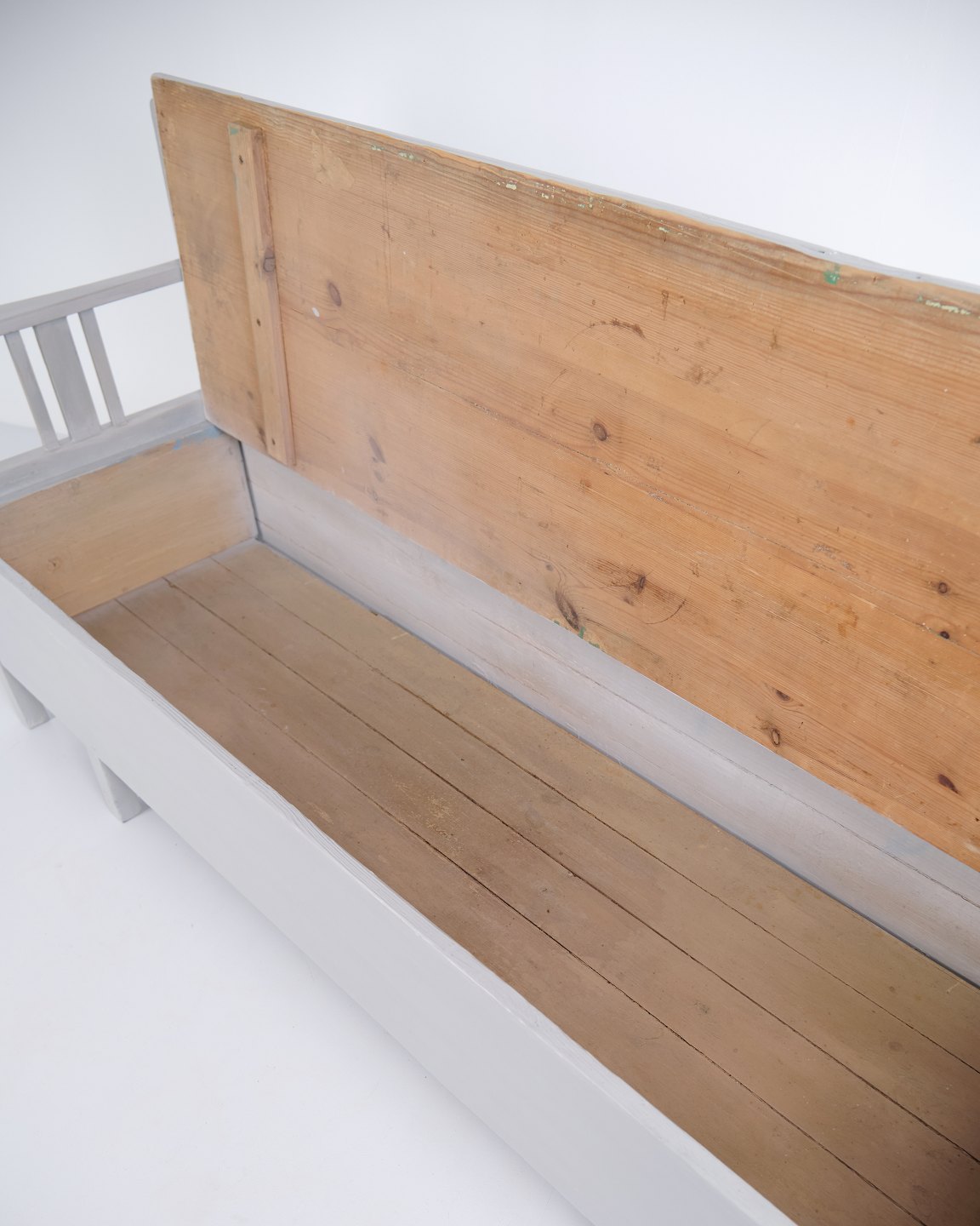 Swedish bench from the 1860s, made in pine and later painted in grey. A classic Scandinavian piece with decorative painted details and practical seating and storage function. Solid antique furniture with characteristic period features.— Origin: Sweden