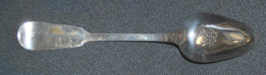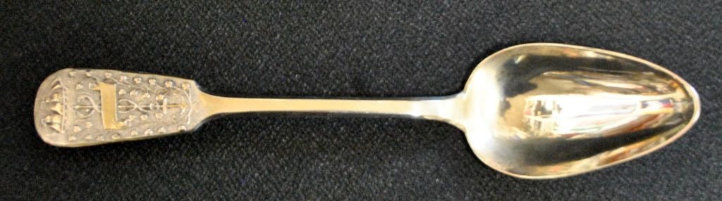 Silberner Skipperlöffel. 1875. Pärnus, Estland. Von der Firma Jacob Jacke & Co. Geschenk an Skipper JR Eriksen. Namensgravur. Der Löffel ist unter anderem mit Anker und Segelschiff verziert. Unbekannter Silberschmied. Länge: 21 cm. Mit Gravur auf der linken Seite.Bestellnummer: 28732