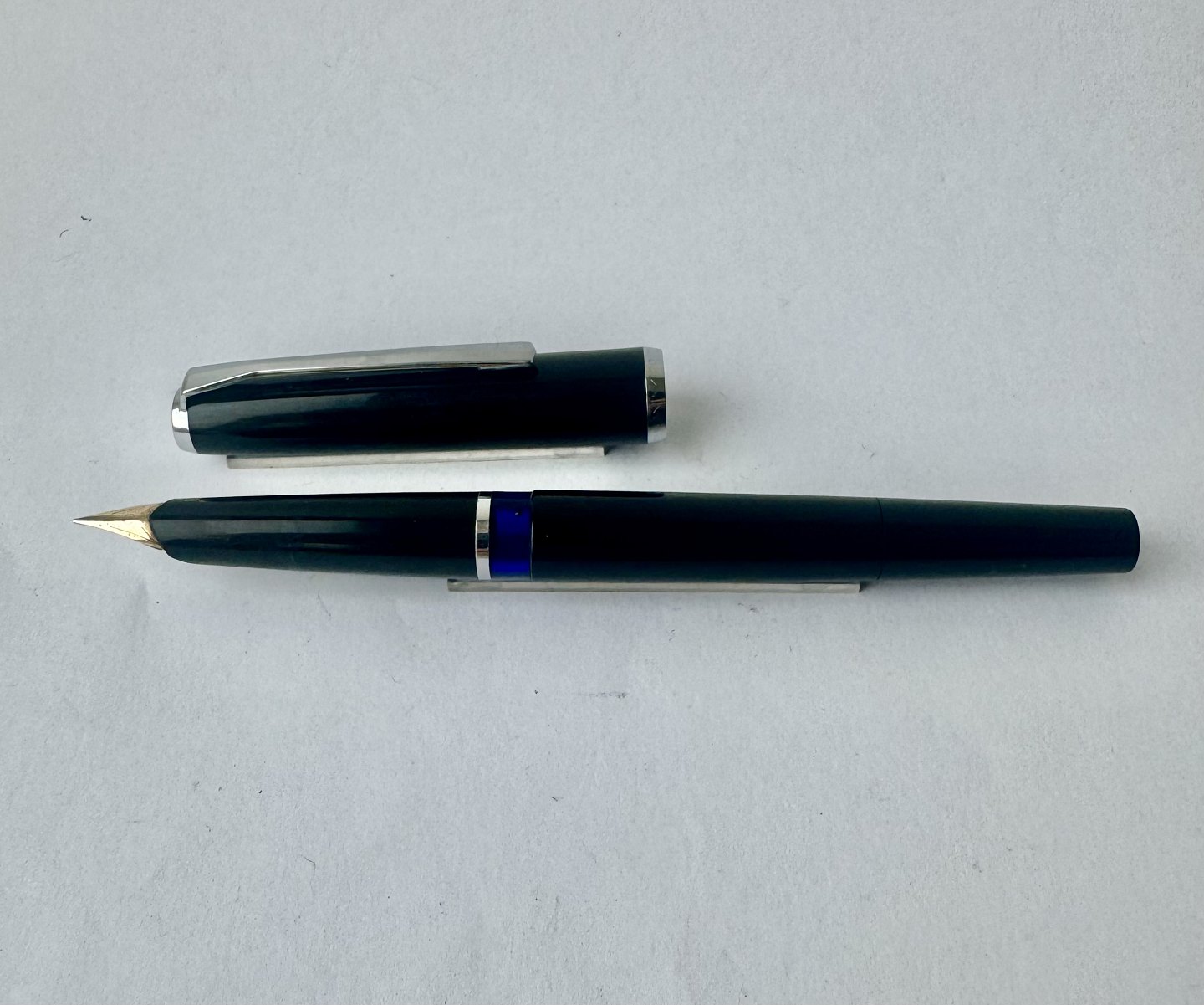 Ældre sort Pelikan Silvexa 20 fyldepen med forkromet dele. Fremstillet i Tyskland i midten af 1960’erne. Der skal indsættes ny refill før end den igen er skrivedygtig. Længde: 13,4 cm