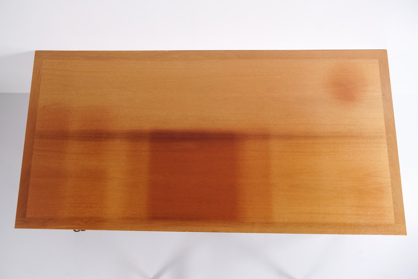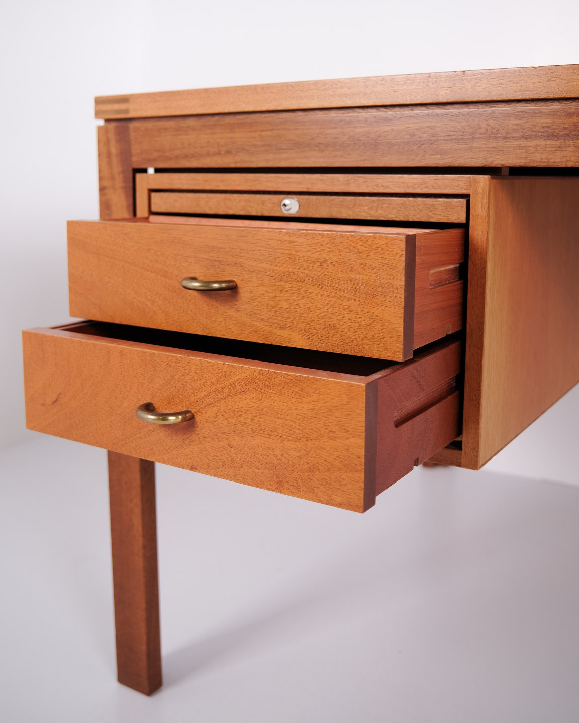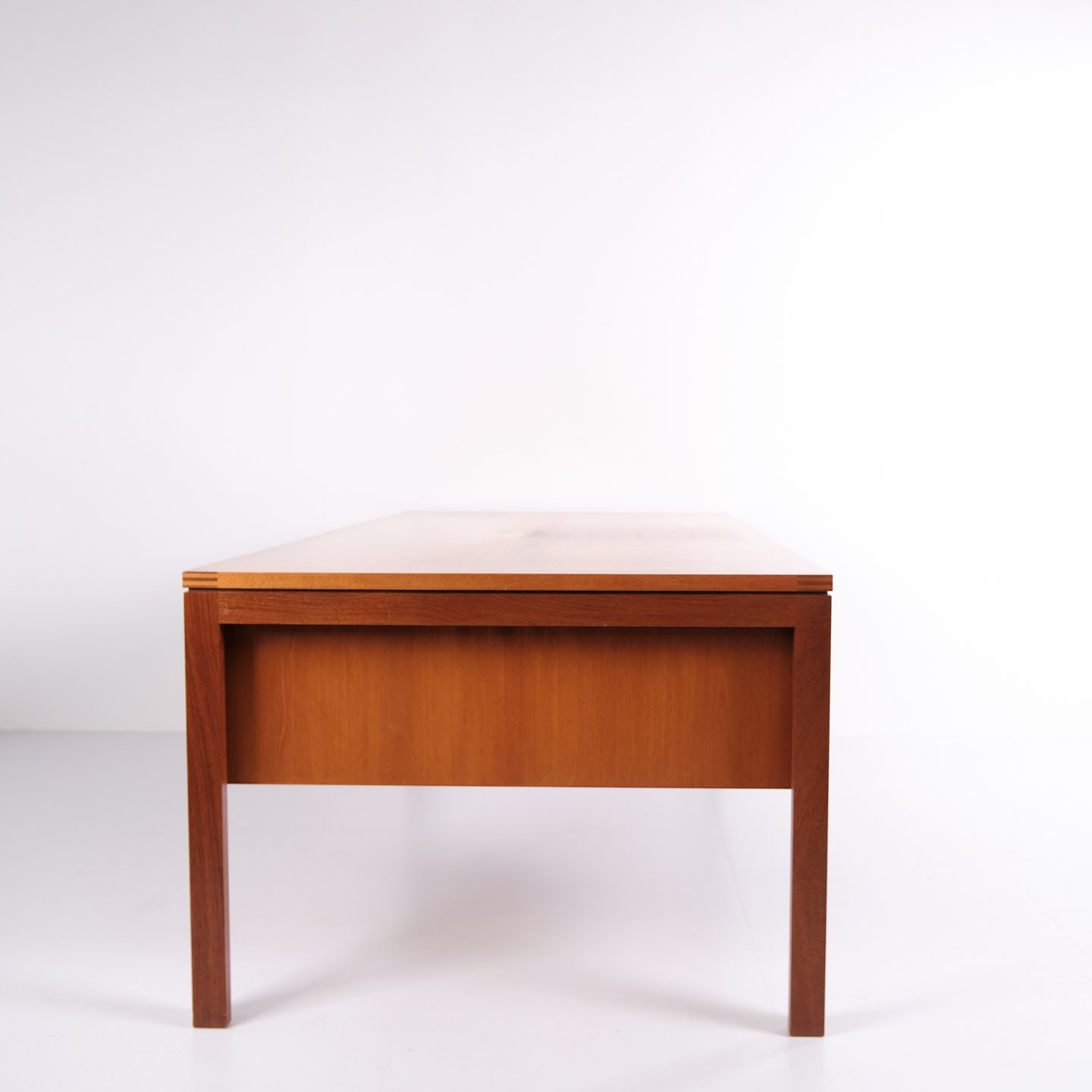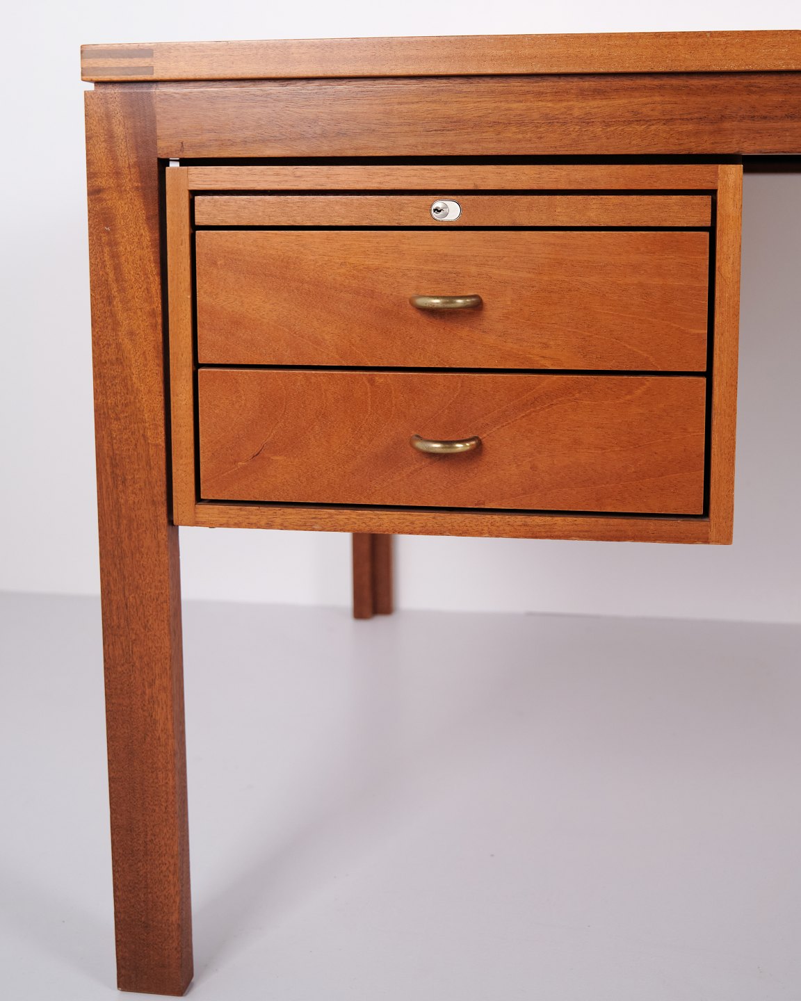 SM 76 Schreibtisch, entworfen 1976 von Christian Hvidt und Orla Mølgaard und produziert von Søborg Møbelfabrik. Gefertigt aus Mahagoni mit drei Schubladen und gezinkten Eckverbindungen. Ein großer und solider Direktionsschreibtisch aus einer anerkannten dänischen Möbelserie. Präsentiert in gutem Zustand.— Designer: Christian Hvidt & Orla Mølgaard