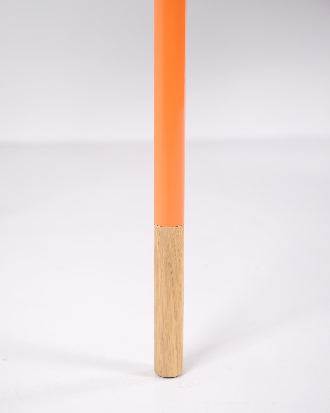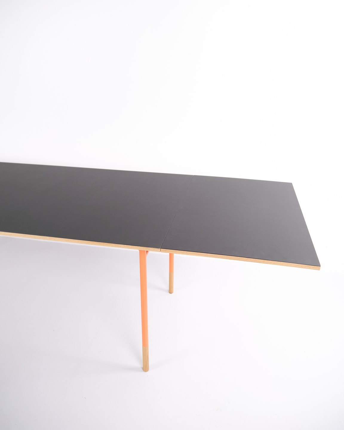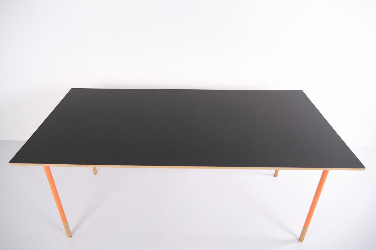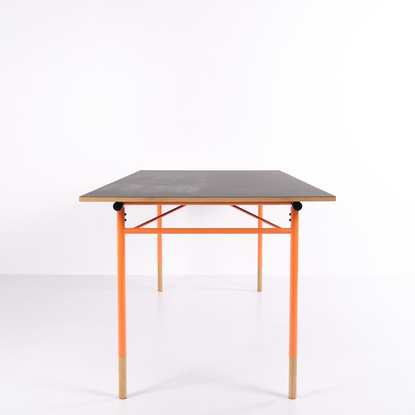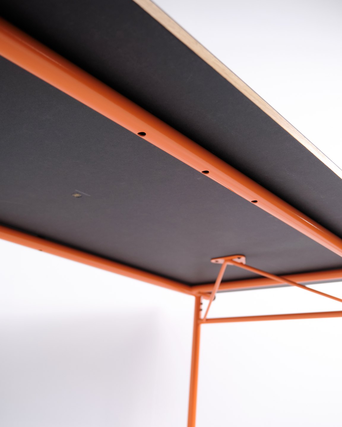 — Materialien: Graues Linoleum, Oregon Pine, orange lackierte Stahlbeine