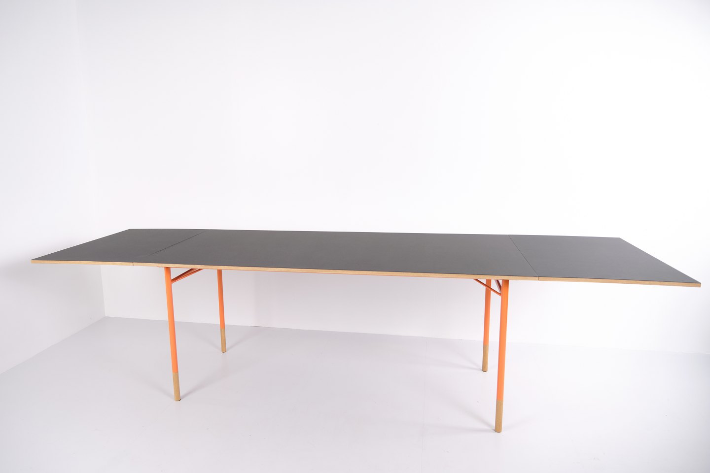 Nyhavn Dining Esstisch, entworfen von Finn Juhl im Jahr 1953 und 2015 von House of Finn Juhl produziert. Tischplatte in grauem Linoleum mit Kanten aus Oregon Pine, getragen von orange lackierten Stahlbeinen mit Holzfüßen. Inklusive zwei Erweiterungsplatten à 54 cm. Ein klassisches Finn-Juhl-Design mit charakteristischen Materialien und leichtem Ausdruck.— Designer: Finn Juhl