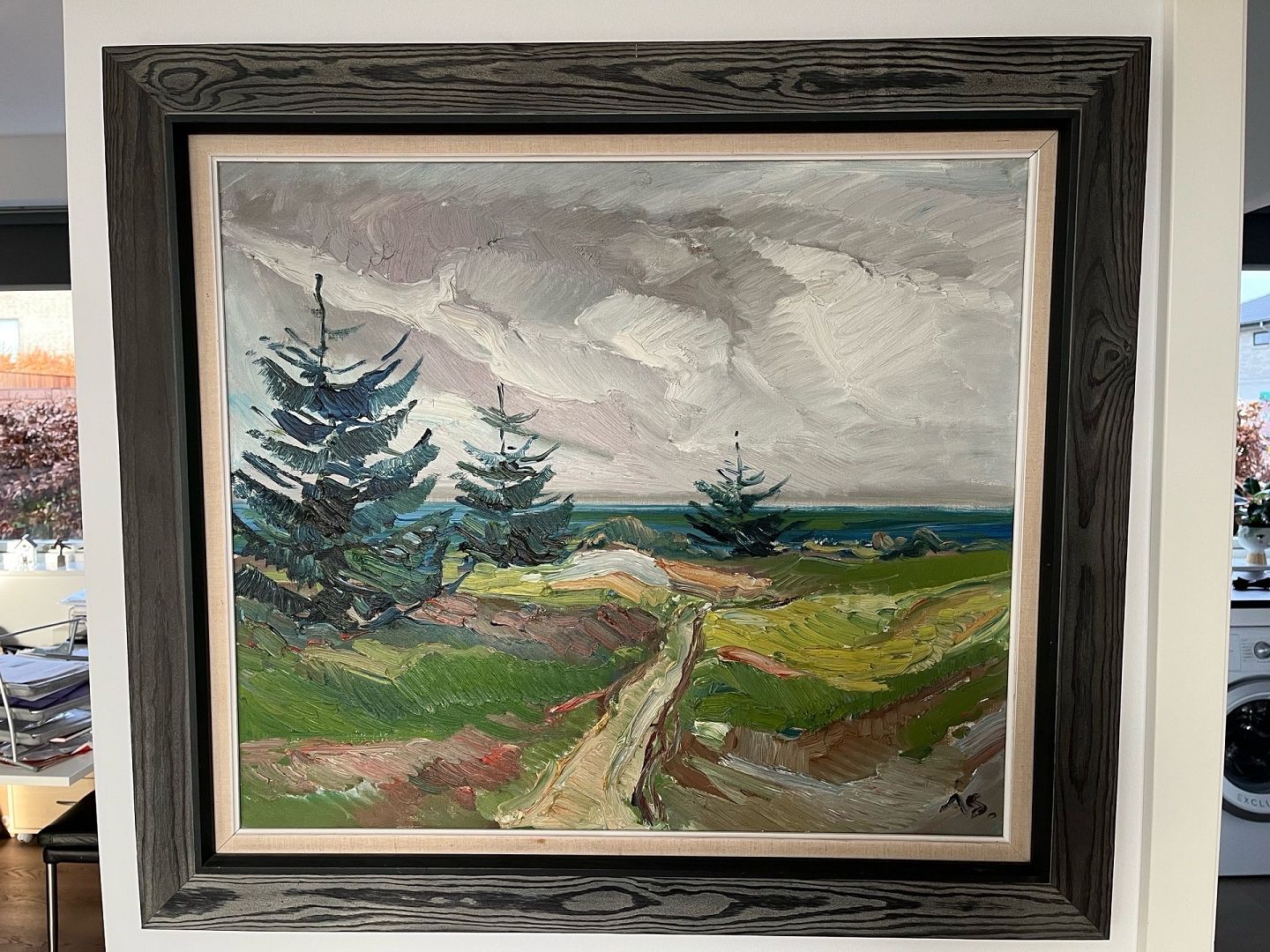 Maleriet er et landskabsmaleri udf�rt af den danske kunstner Aage Strand (1910�1975). V�rket er skabt i en modernistisk/impressionistisk stil og kendetegnes ved en markant anvendelse af impasto-teknik, hvor oliefarven er p�f�rt i tykke lag for at skabe tydelig tekstur og dybde.Oplysninger om v�rket:� Kunstner: Aage Strand (1910�1975), dansk maler.� Stilart: Modernisme/Impressionisme, karakteriseret ved synlige penselstr�g samt fokus p� lys- og farvespil.� Teknik: Oliemaleri p� l�rred udf�rt med impasto.� Motiv: Kyst- eller klitlandskab med graner og vand i baggrunden � et typisk motiv i Strands oeuvre, ofte inspireret af hans hjemegn i Nordjylland.� Signatur: V�rket er signeret, formentlig med kunstnerens initialer �AS�, nederst til h�jre.M�l.89�79Maleriet fremst�r i fremragende stand uden synlige fejl eller skader.Levering kan arrangeres850 / 5.000