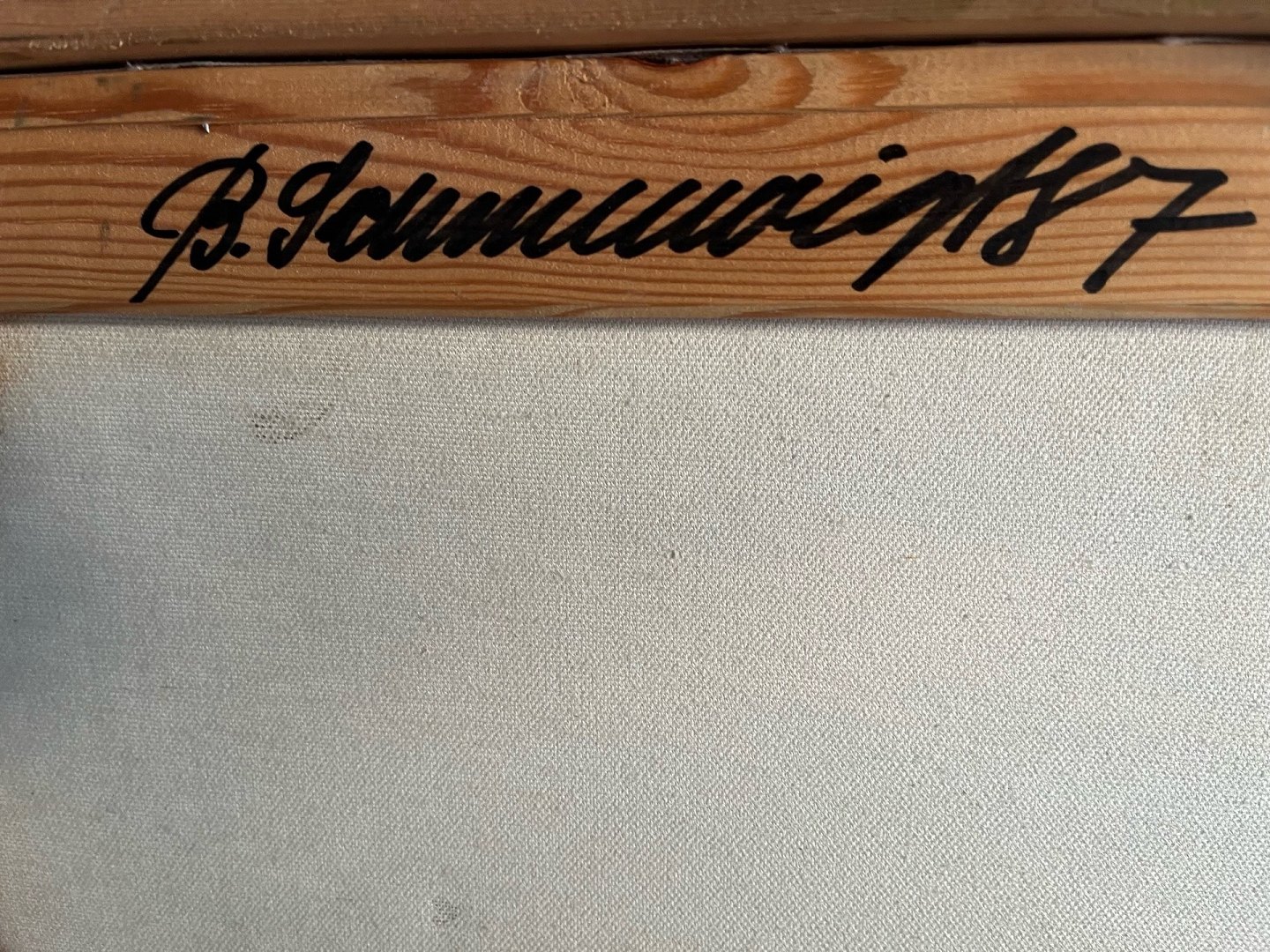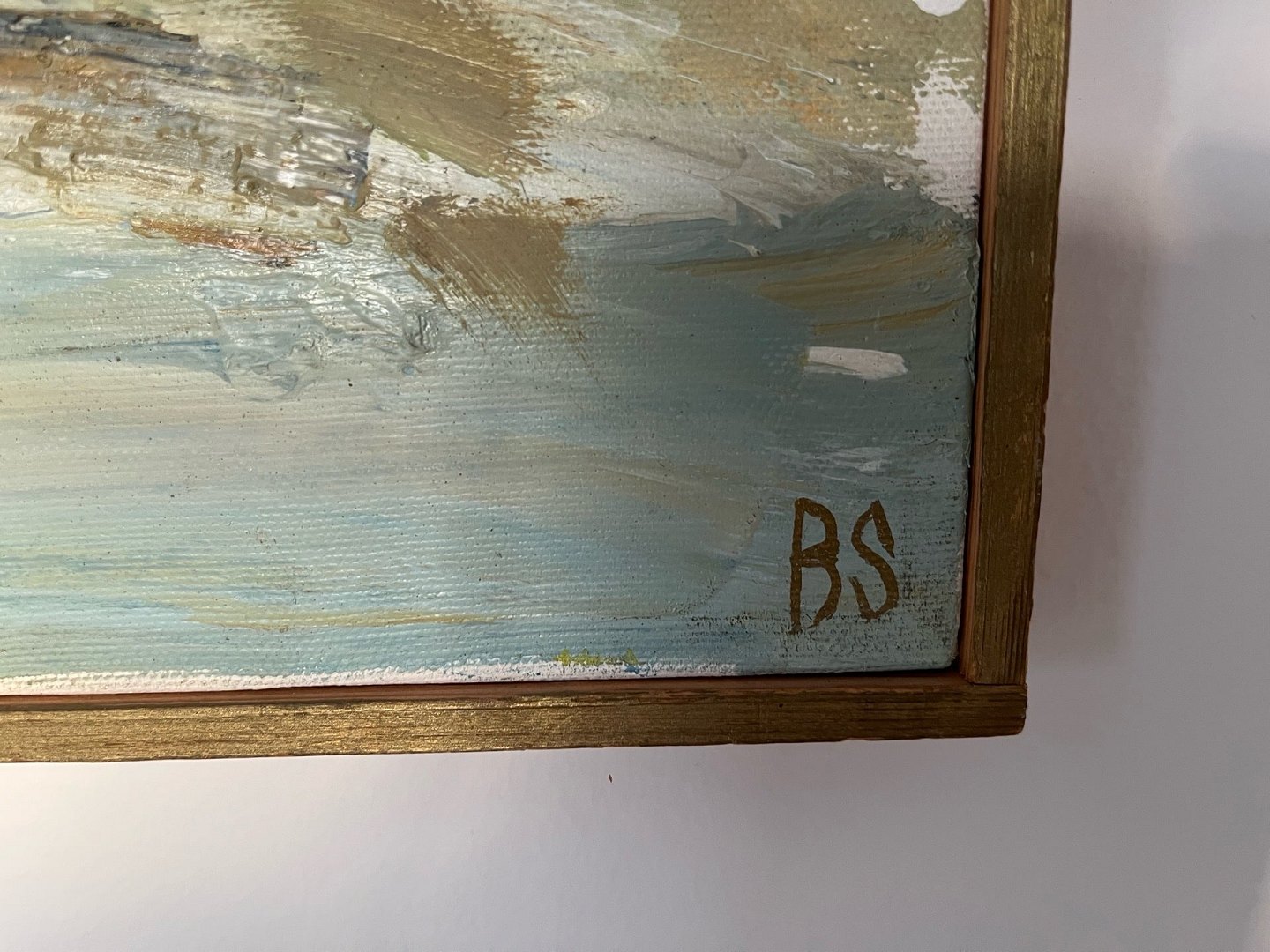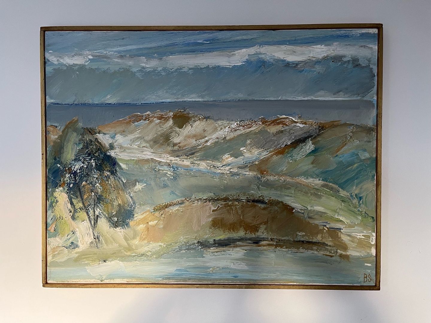 Dette er et maleri, der ser ud til at v�re i en abstrakt ekspressionistisk stil.Stil og teknik: V�rket udnytter en l�s og spontan, ekspressiv teknik, som ofte ses i abstrakte landskabs- eller figurstudier.Farver: Farvepaletten er holdt i afd�mpede, fint afstemte nuancer domineret af gr�-hvide og gr�-bl� toner, med kontrasterende indslag af okker og brunlige farver.Motiv: Detaljerne i maleriet, is�r i den venstre del, antyder muligvis en abstrakt kvindelig figur eller en fortolkning af kystlinjer/b�lger, hvilket er almindelige motiver i lignende kunst.M�l 67�52Flot stand.Levering muligt.