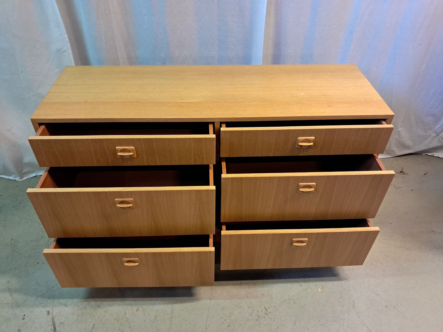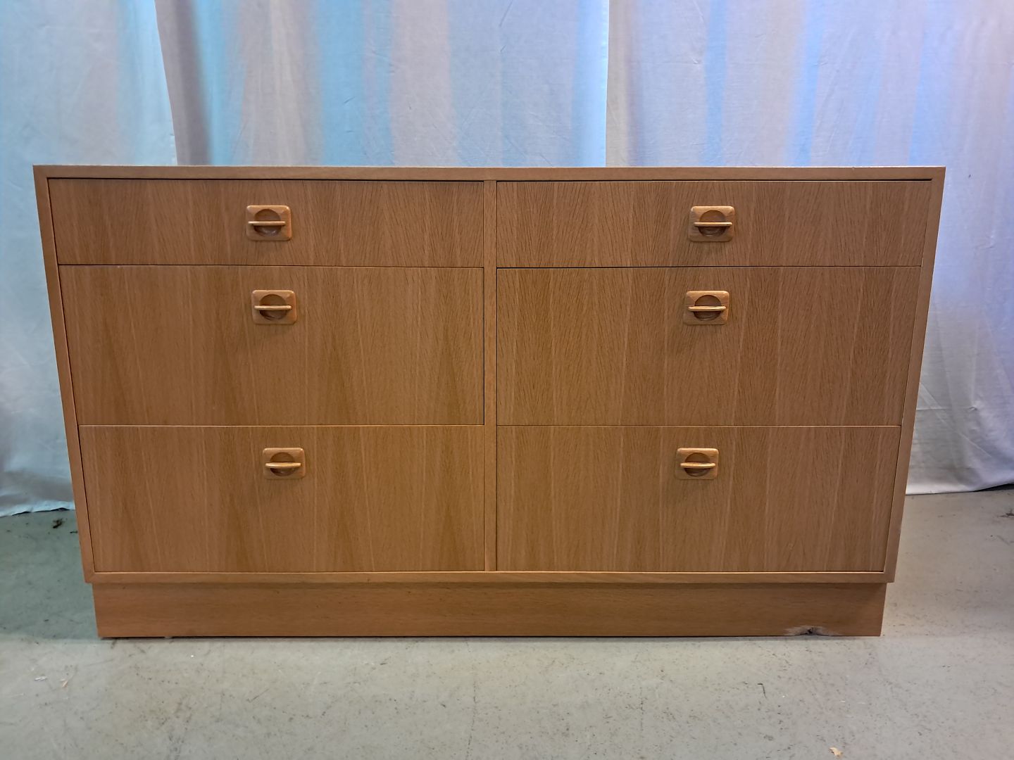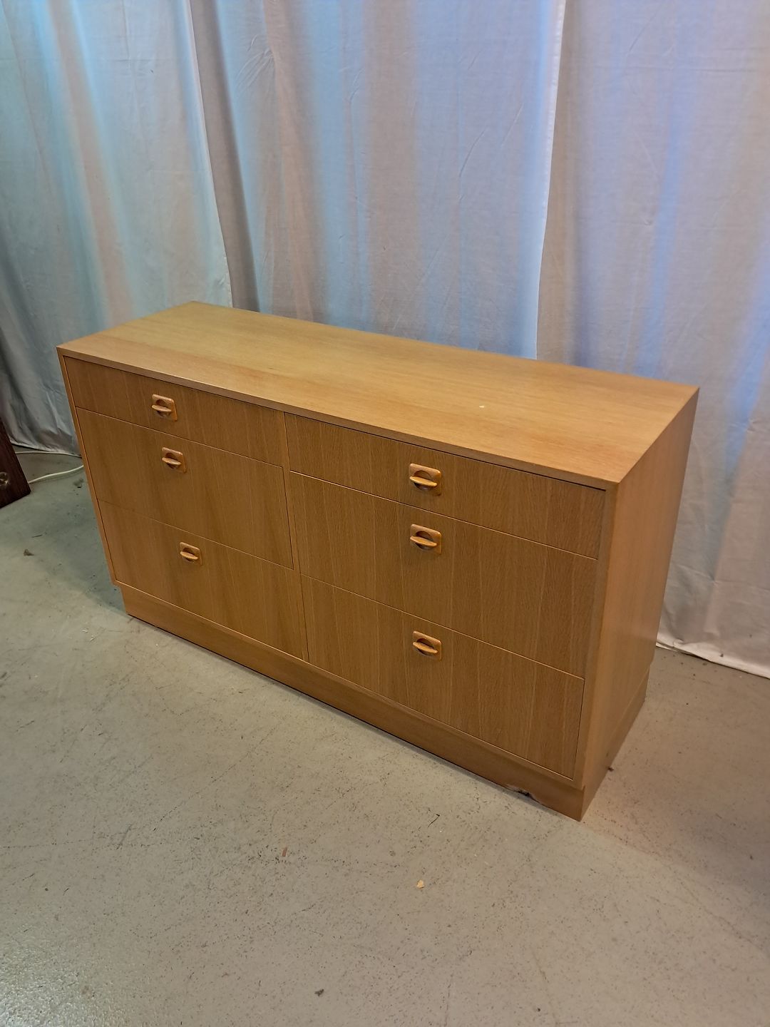 Kommode i fineret egetræ, fra 1980erne.Den har brugsspor og en defekt på soklen.