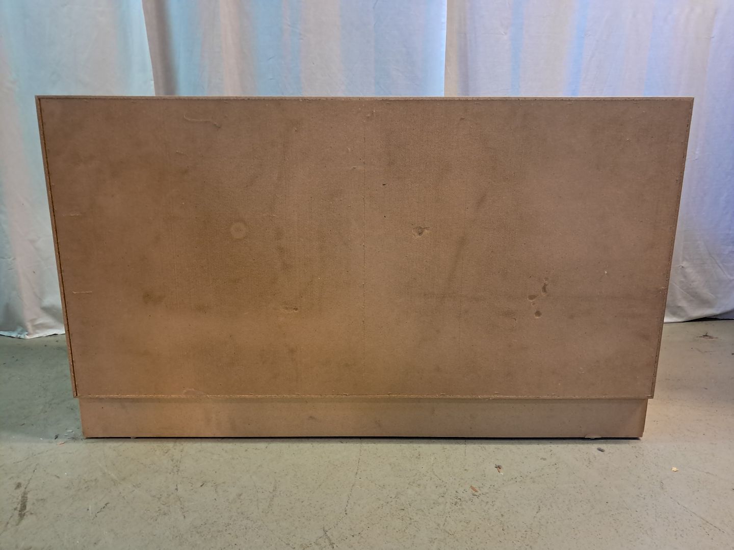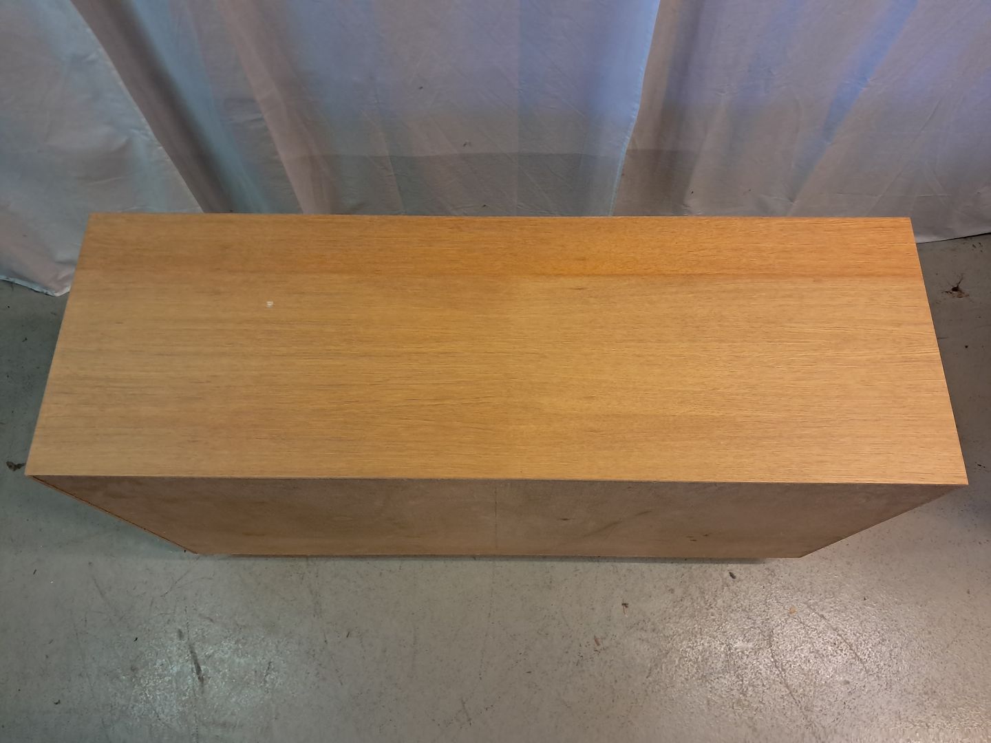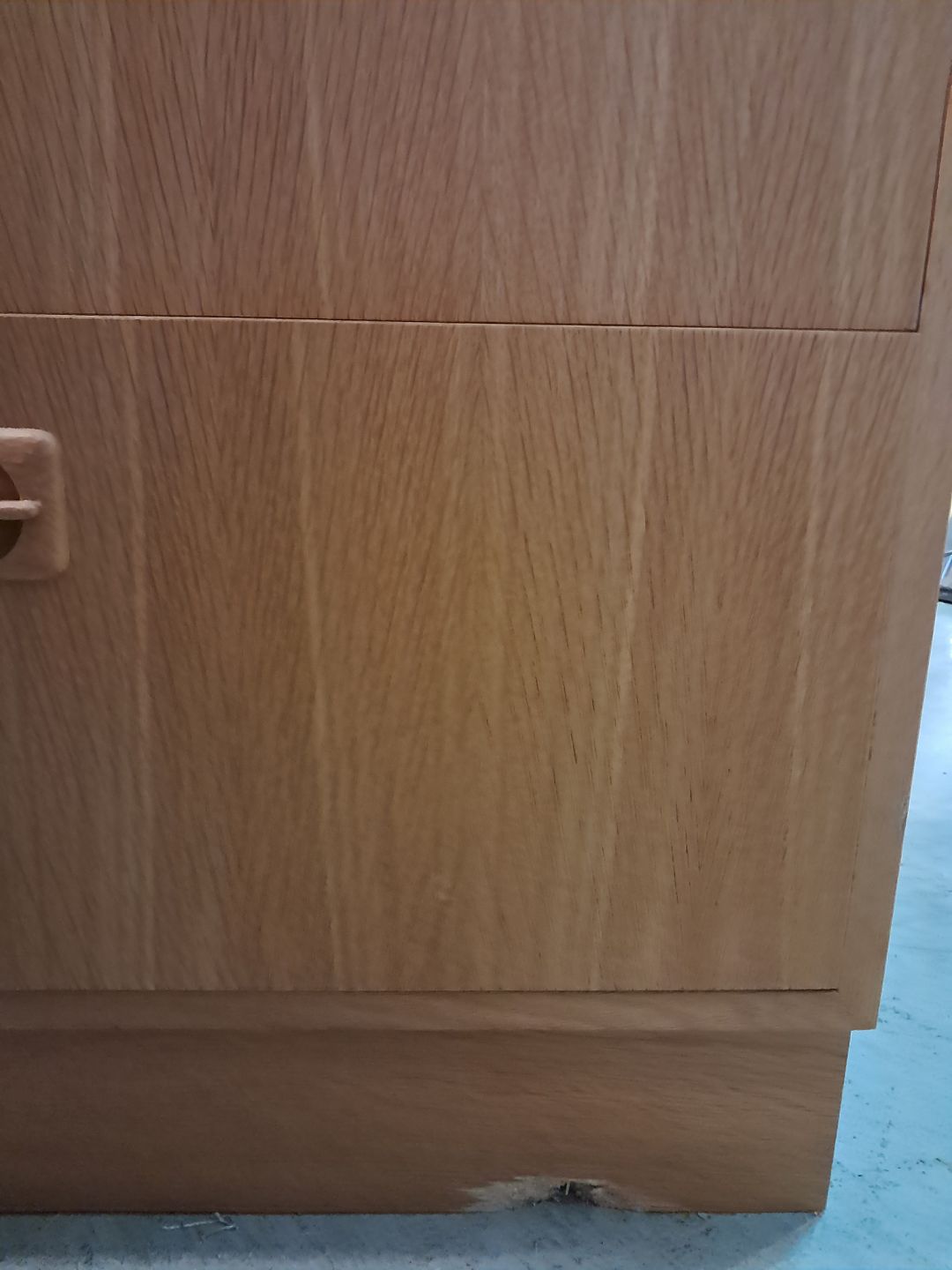 Kommode i fineret egetræ, fra 1980erne.Den har brugsspor og en defekt på soklen.