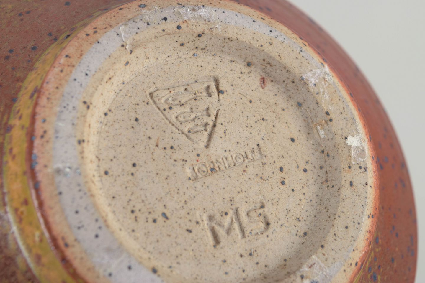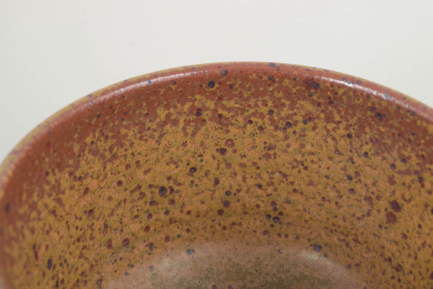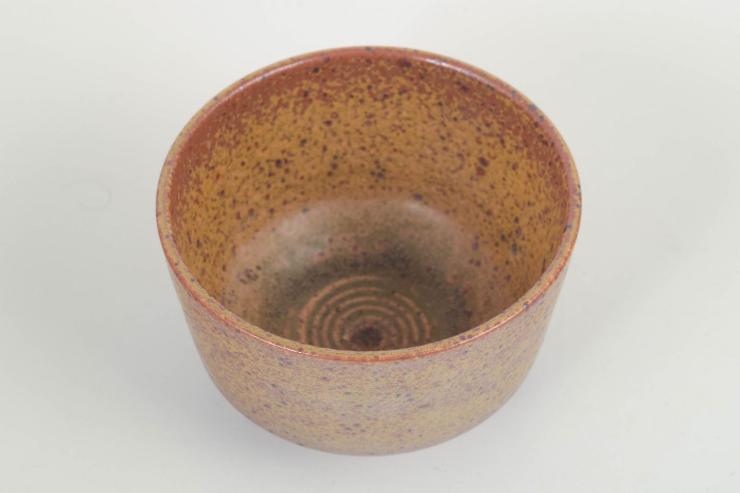 Håndglaseret stentøjsskål i varme brun-gule nuancer med tæt spættet overflade, karakteristisk for Starcks eksperimenterende farve- og teksturunivers i perioden.