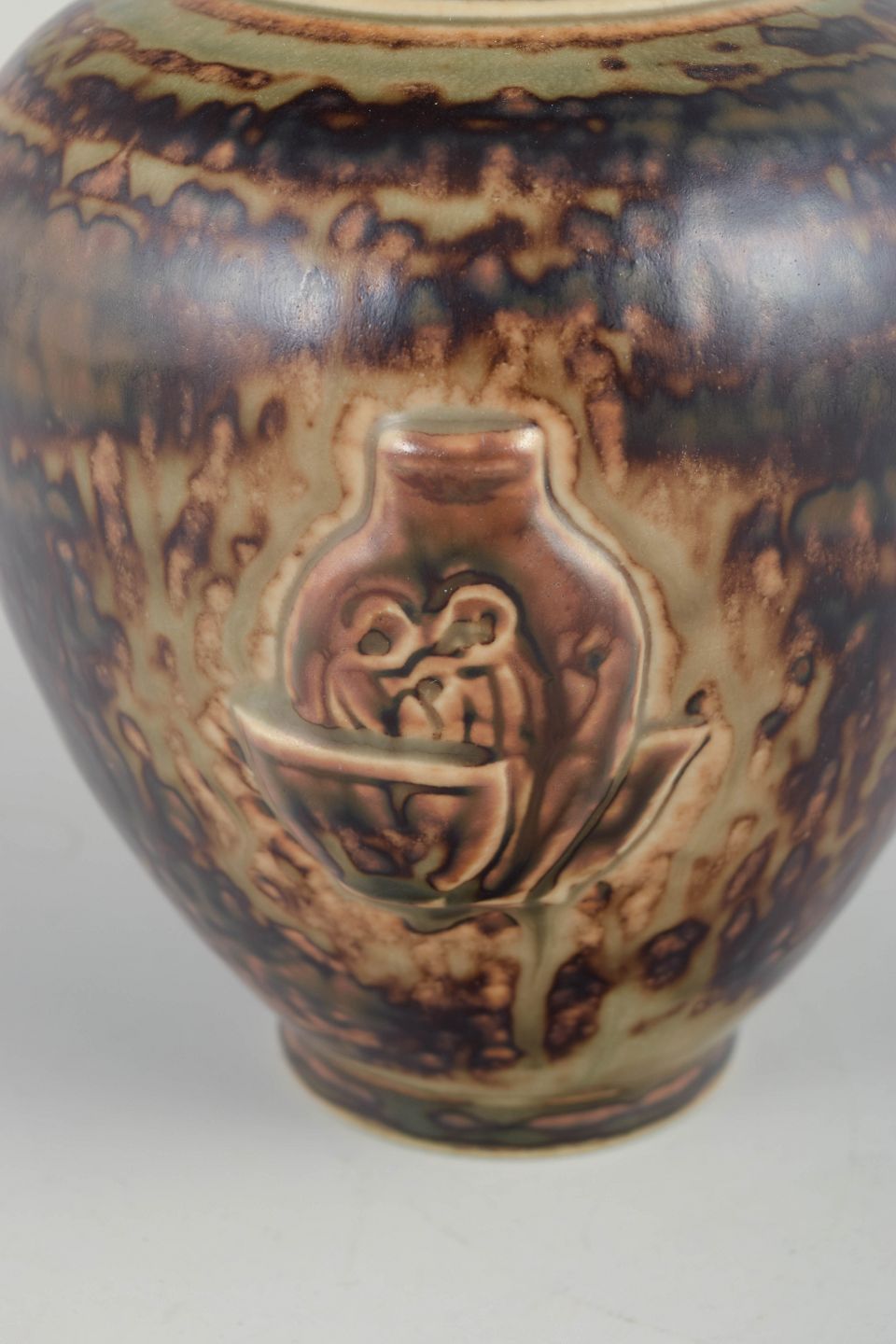 Skulpturelt dekoreret vase i den karakteristiske Sung-glasur, med reliefmotiv af figurativ scene. Den varme, løbende glasur fremhæver de plastiske detaljer og giver værket et markant, næsten metallisk skær.