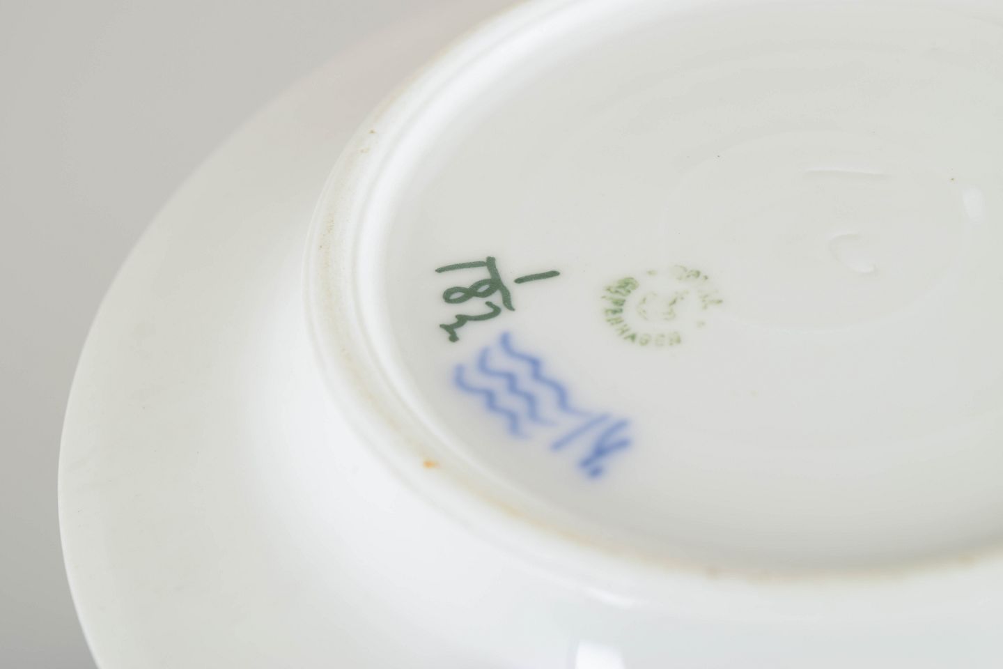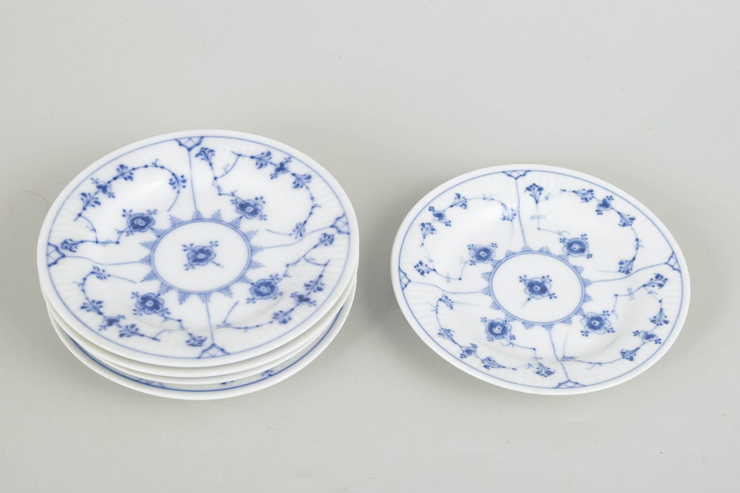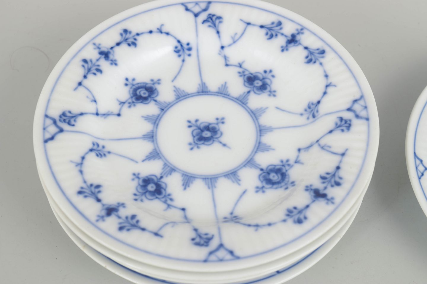 Halvblonde tallerkener i håndmalet porcelæn. Dekorationens fine detaljer og den klassiske form gør modellen til et eftertragtet element i det tidlige 1900-tals produktion.