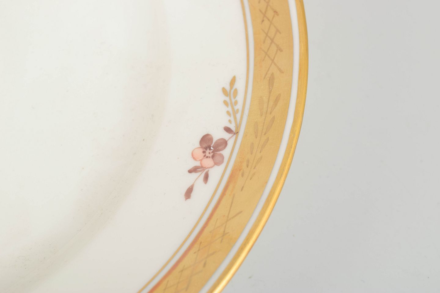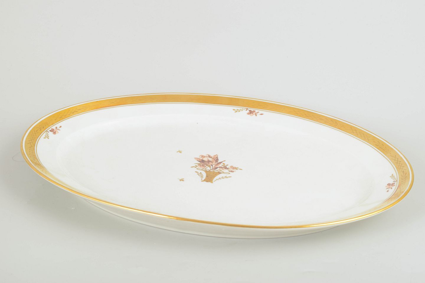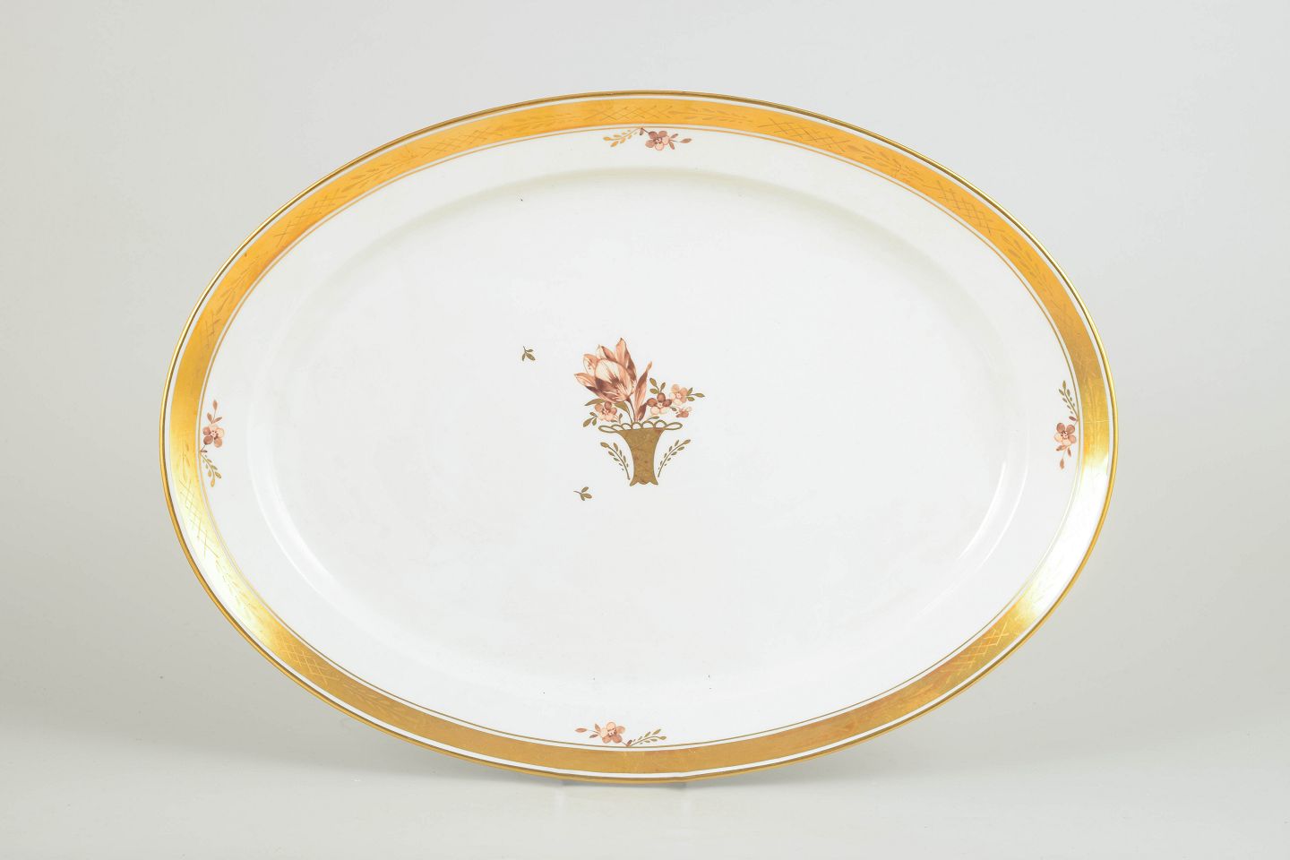 Imponerende stort ovalt serveringsfad i porcelæn fra Royal Copenhagens “Guldkurv”-serie, model 595/9010. Klassisk hvid porcelæn med bred forgyldt kant og det karakteristiske håndmalede blomsterkurvmotiv.