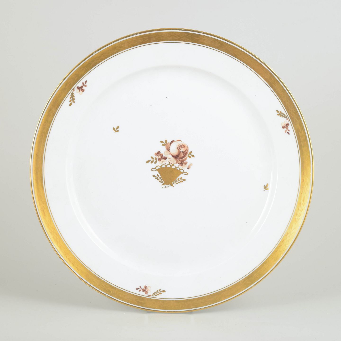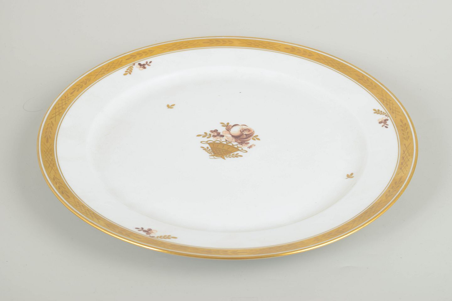 Stort og elegant serveringsfad i porcelæn fra Royal Copenhagens “Guldkurv”-serie, model 595/9047. Udført med bred forgyldt kant og det klassiske håndmalede blomsterkurvmotiv i centrum.