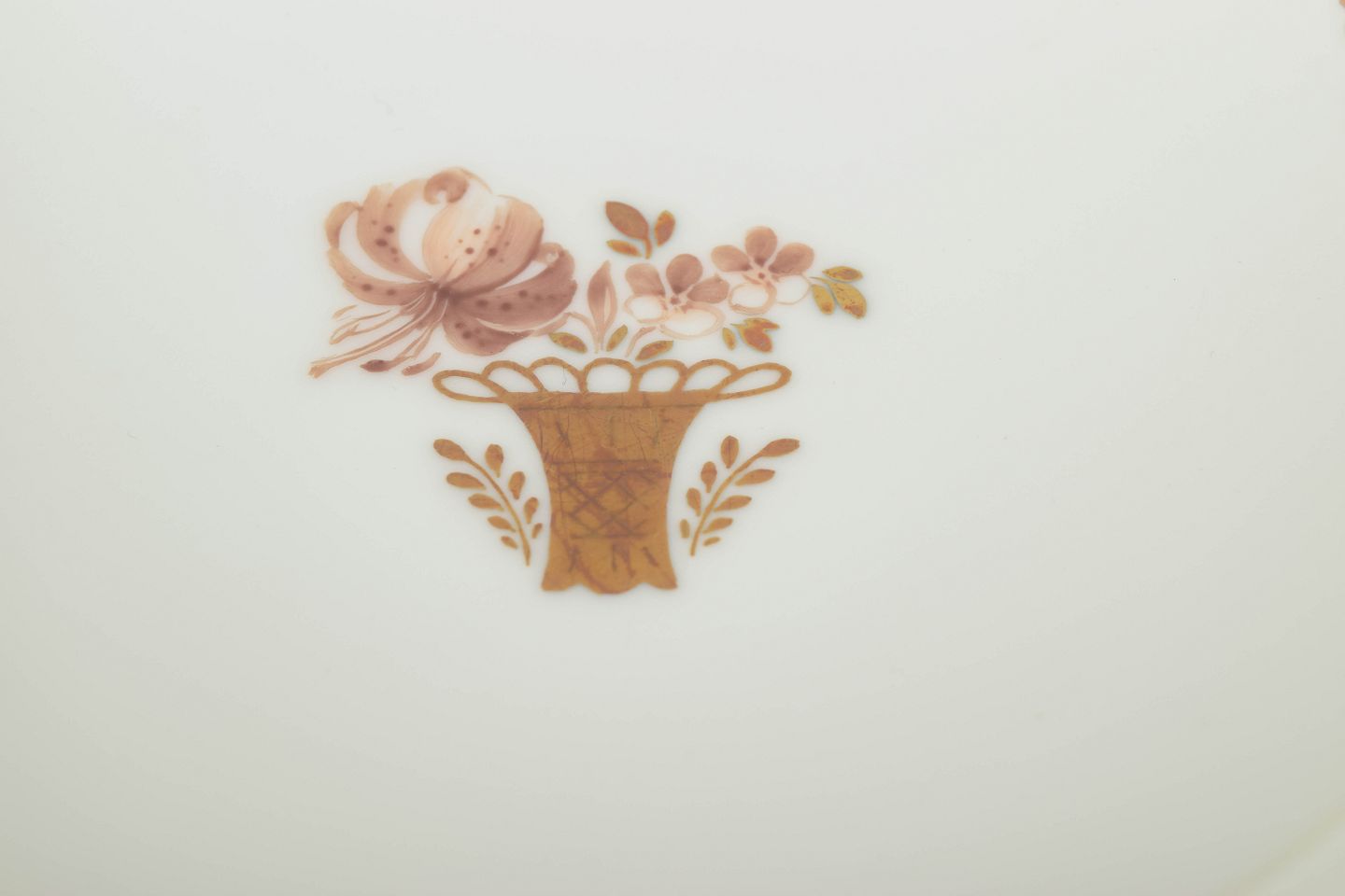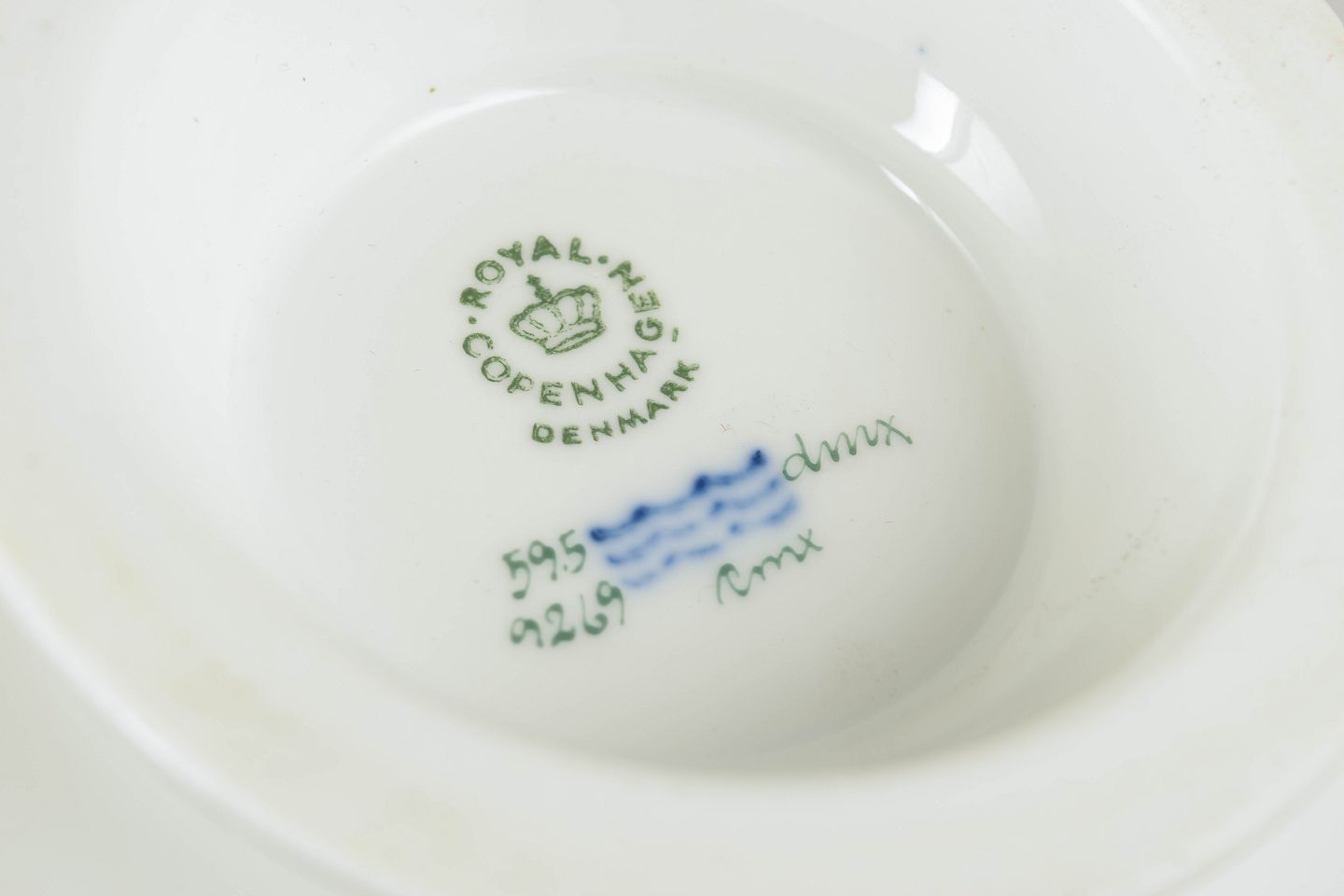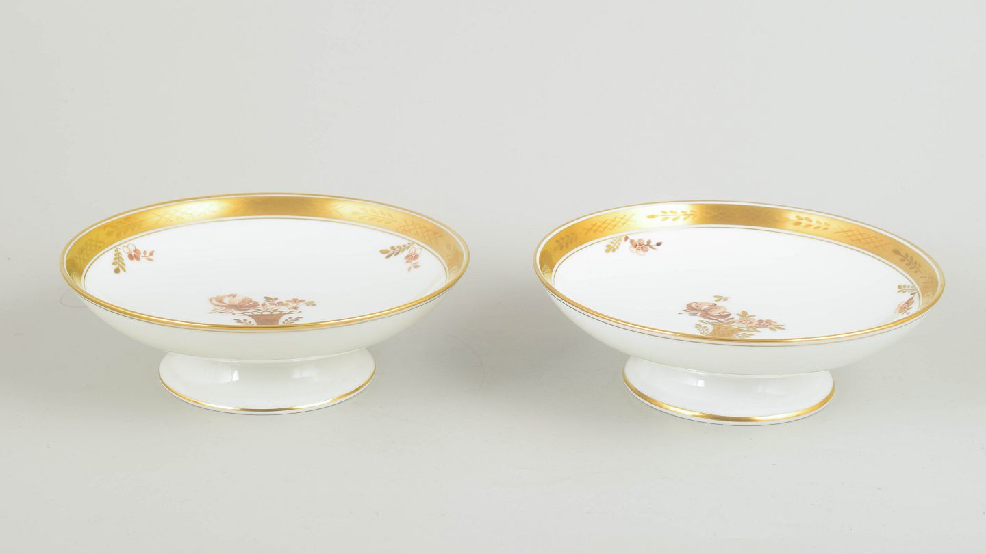 Royal Copenhagen Guldkurv, par opsatser i porcelæn fra Royal Copenhagens “Guldkurv”-serie, model 595/9269. Begge udført med forhøjet fod, bred forgyldt kant og håndmalet blomsterkurvmotiv.