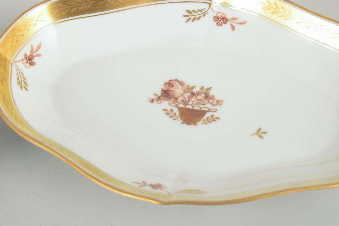 Sæt med to elegante kagefade i porcelæn fra Royal Copenhagens “Guldkurv”-serie, model 595/9626. Begge i 1. sortering med forgyldte kanter og håndmalede blomsterdekorationer.