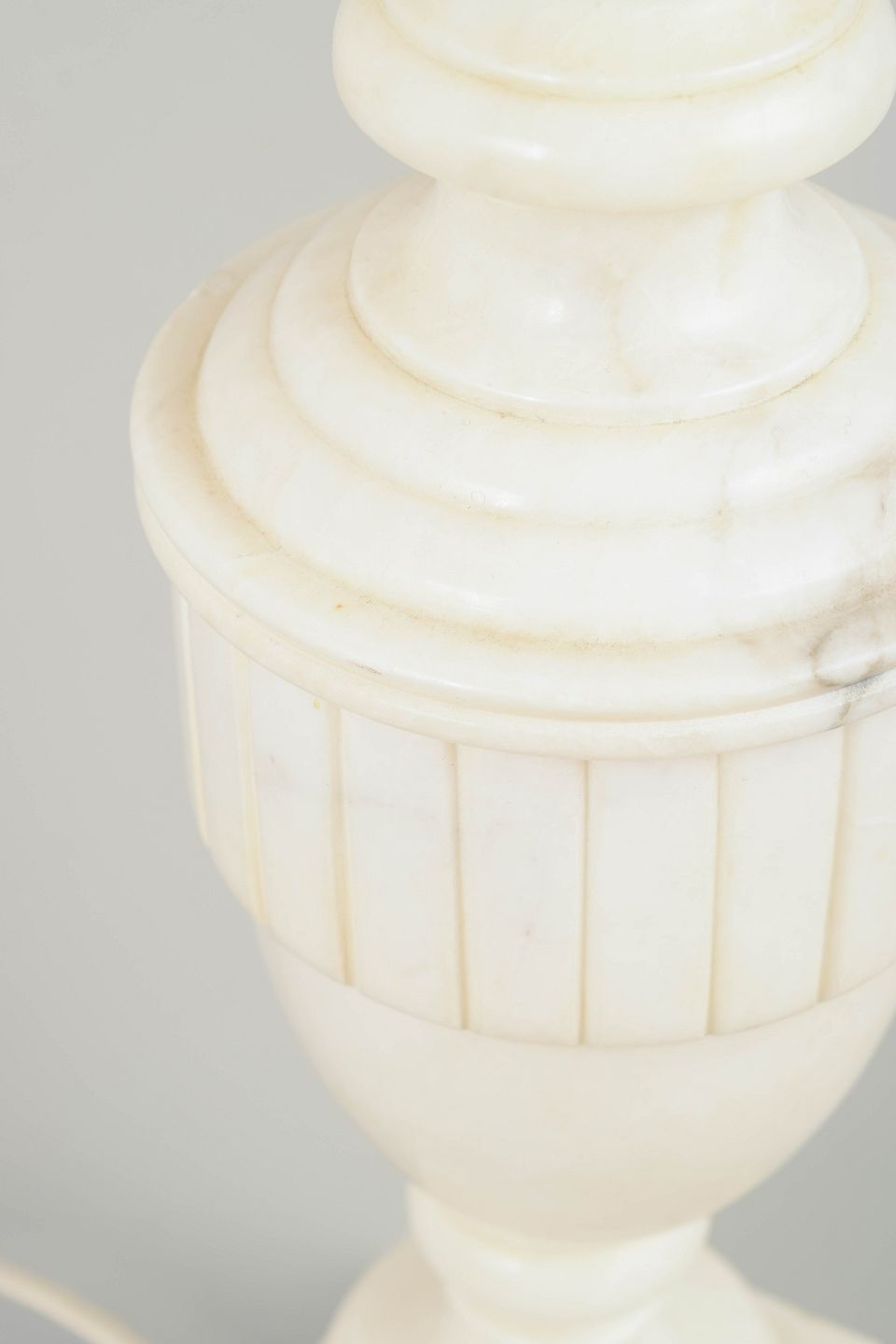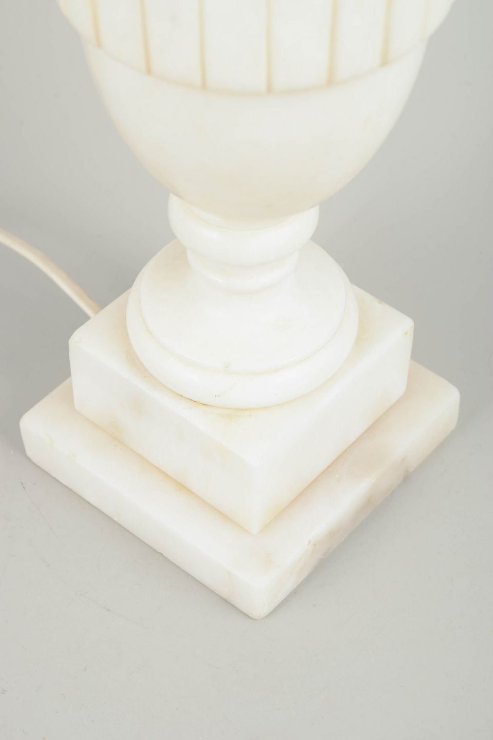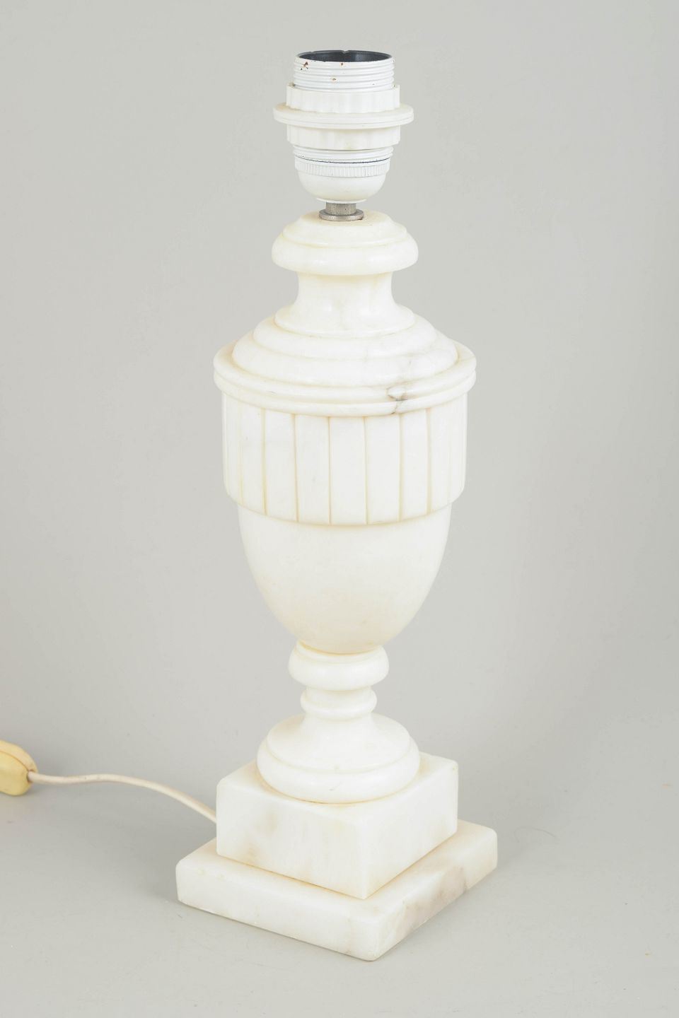 Italiensk Marmor Bordlampe, 1970’erne.Klassisk formet bordlampe i hvid marmor med tydeligt profileret topstykke og vertikale riller på midterpartiet. Den enkle balusterform og den kvadratiske fod giver lampen et harmonisk og tidløst udtryk.