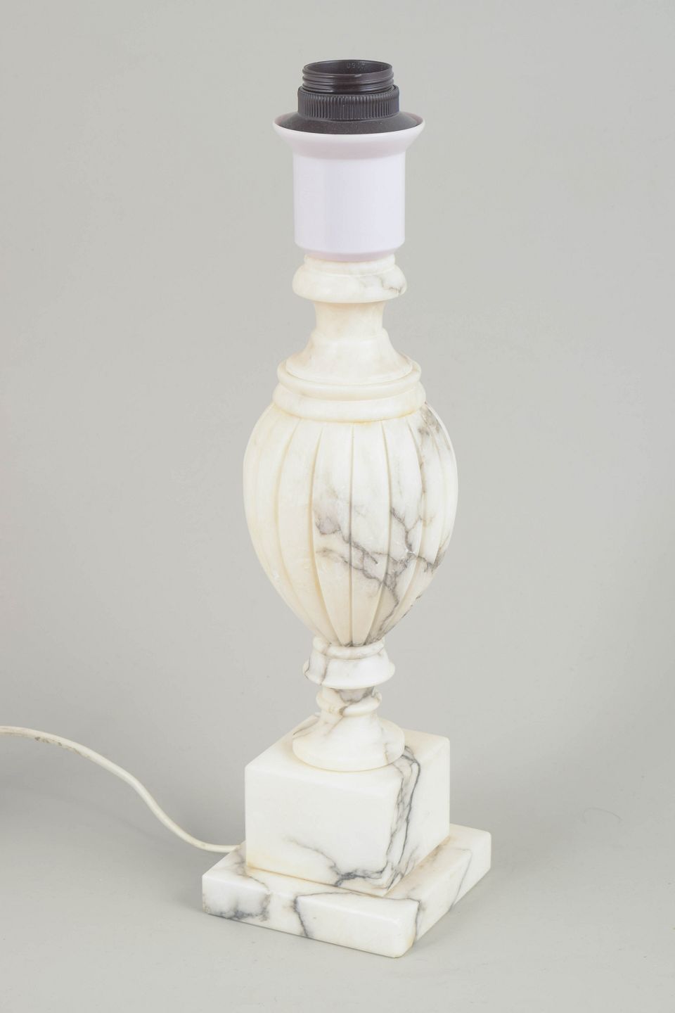 Italiensk Marmor Bordlampe, 1970’erne.Elegant bordlampe udført i hvid marmor med markant årestruktur og klassisk balusterformet midterstykke. Den profilerede fod og de bløde, vertikale facetter giver lampen et raffineret og dekorativt udtryk.