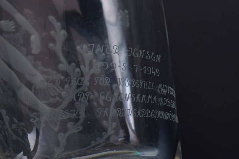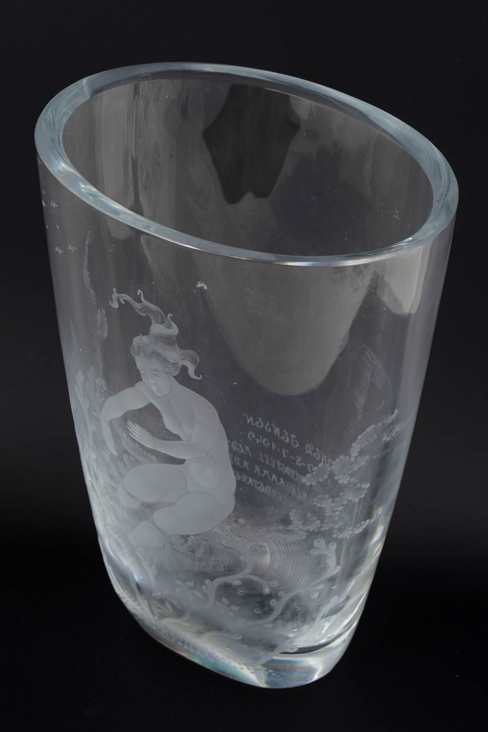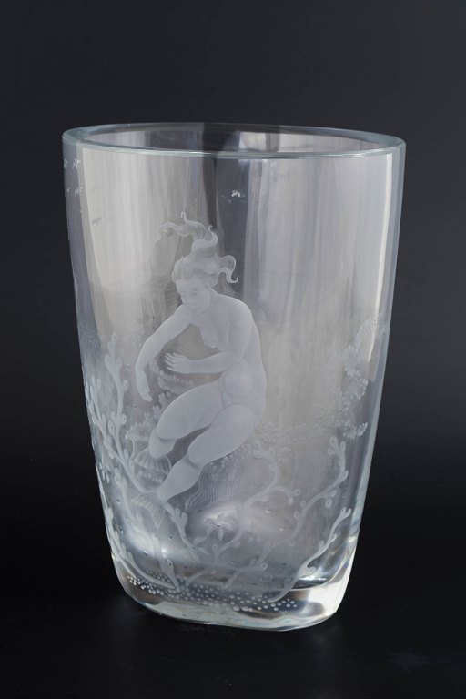 Sjælden Art Deco vase med dyb, sandblæst og graveret dekoration af en svævende kvindefigur omgivet af bølger og vandplanter. Et teknisk og kunstnerisk imponerende arbejde, udført med stor præcision og et karakteristisk skandinavisk formsprog.