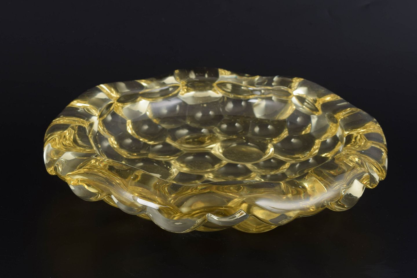 Rare yellow pressed-glass bowl with characteristic Art Deco ornamentation and organic, undulating rim. Pierre d’Avesn’s signature use of bold relief and geometric structure is clearly evident in this decorative and highly desirable example.