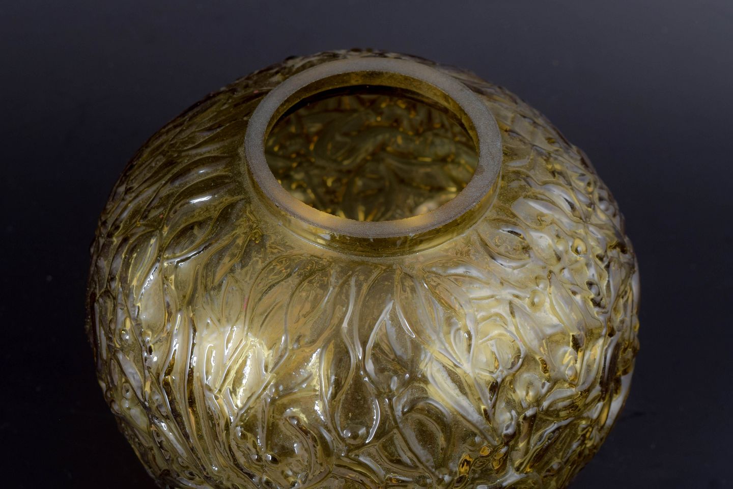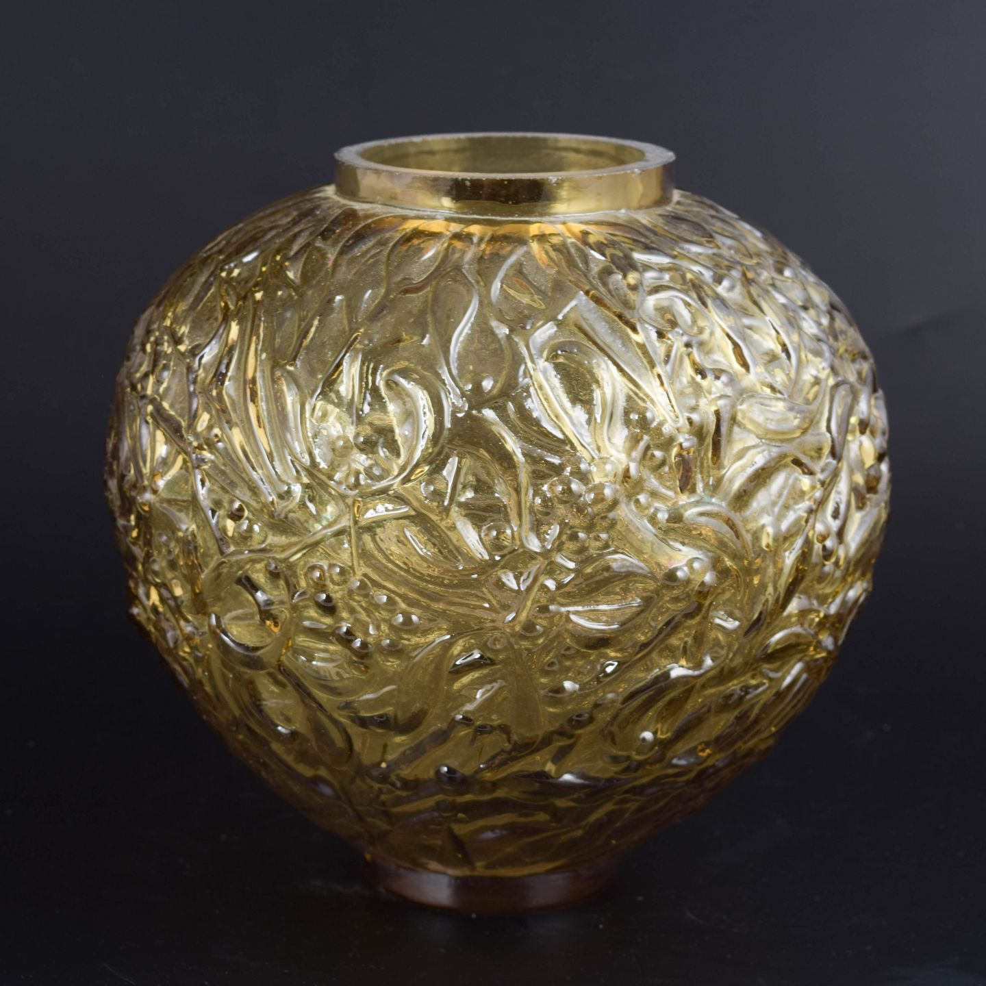 Decorative, mouth-blown vase in amber-coloured glass with deeply moulded relief featuring leaves and berries. The organic ornamentation and warm tone are characteristic of French art glass from the mid-20th century.