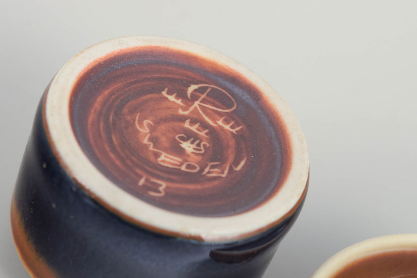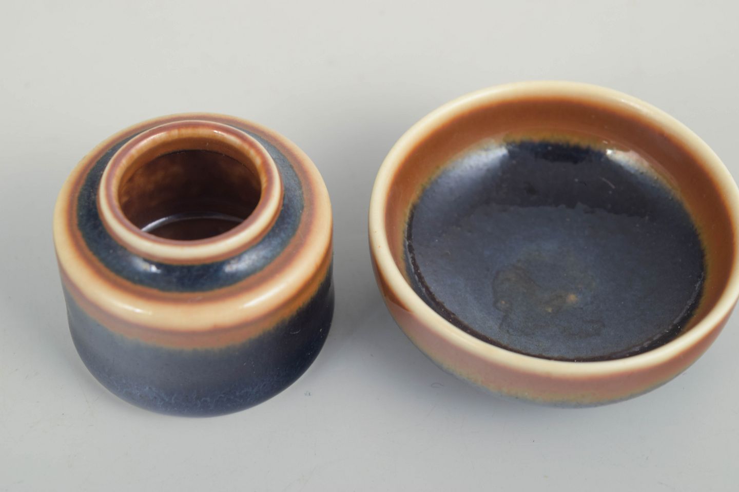 To små stentøjsobjekter i klassisk Stålhane-udtryk med dybe blåviolette glasurer, nuanceret af varme rosa og brune toner. Formsproget er enkelt og raffineret, typisk for Stålhane’s arbejde i 1950’erne og 60’erne.