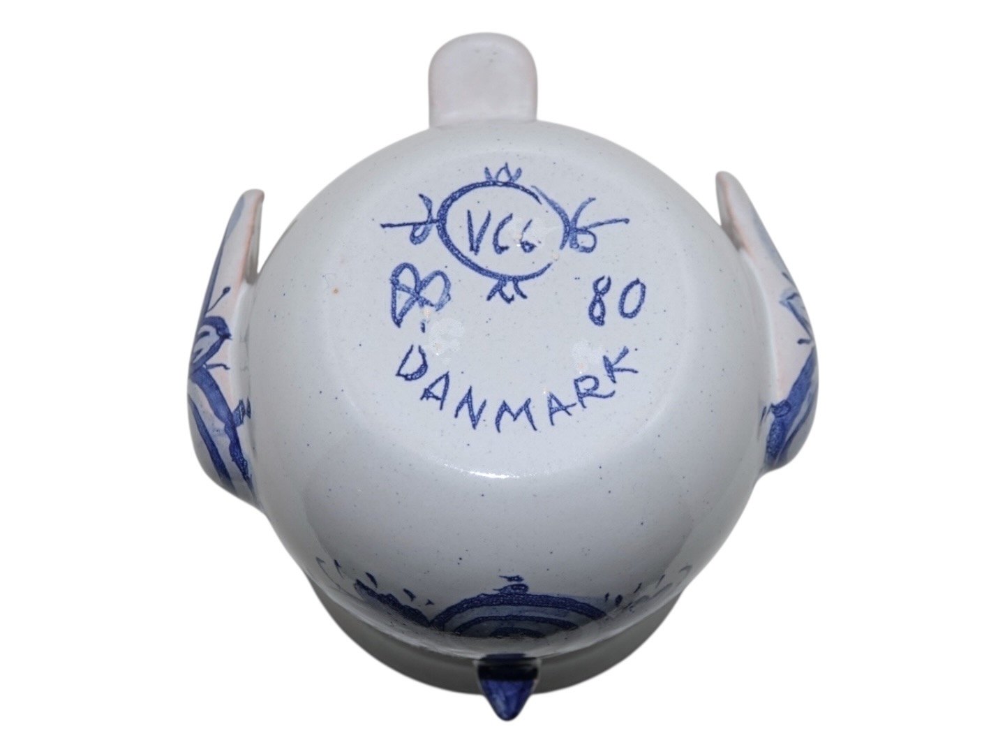 Bjørn Wiinblad keramik, lille urtepotteskjuler i form af fugl med næb, vinger og hale. Denne er med blå dekoration.Dekorationsnummer V66. Denne er fra 1980.