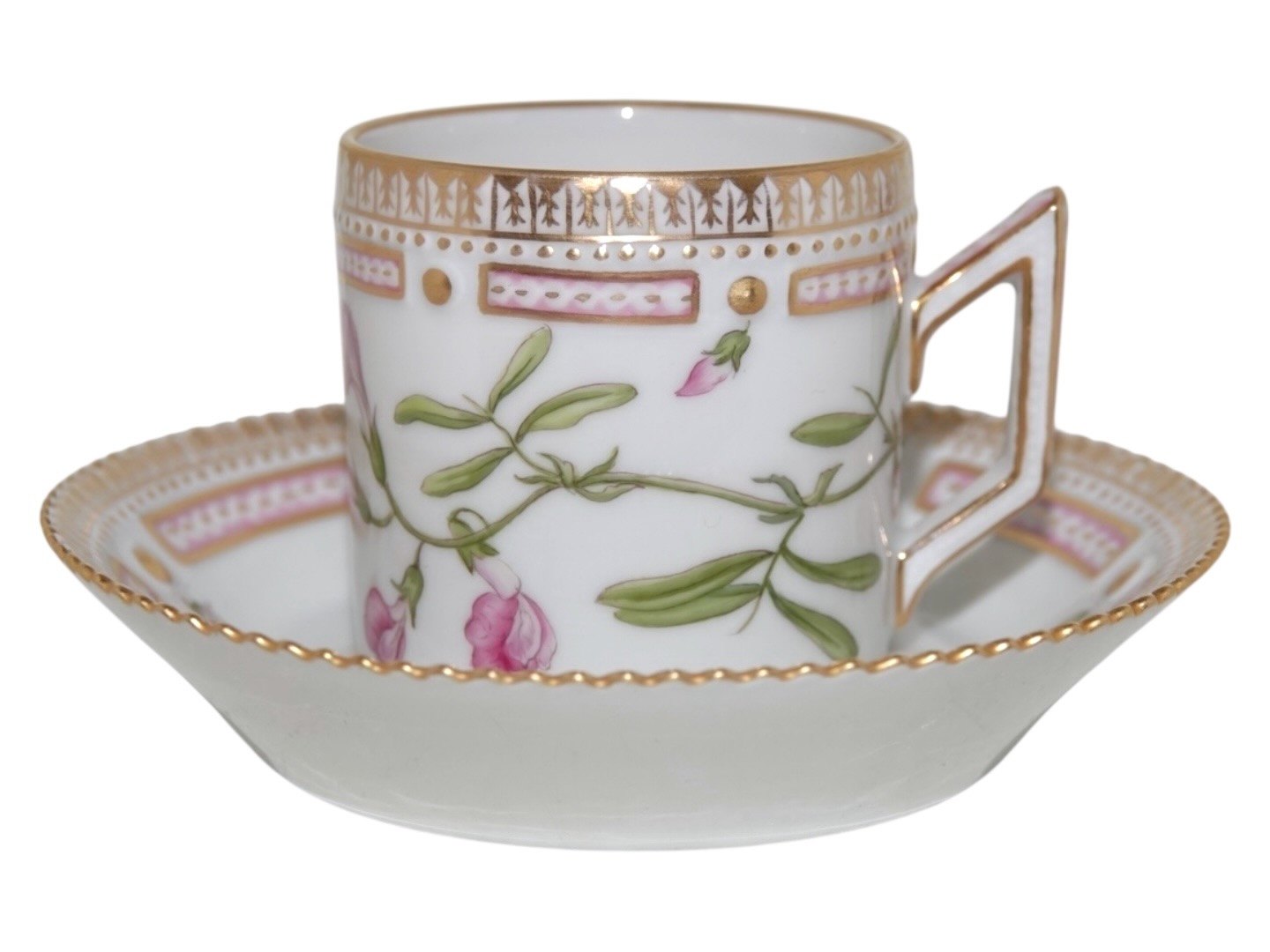 Royal Copenhagen Flora Danica, lille tøndeformet espressokop med tilhørende underkop.Dekorationsnummer 20/3621.