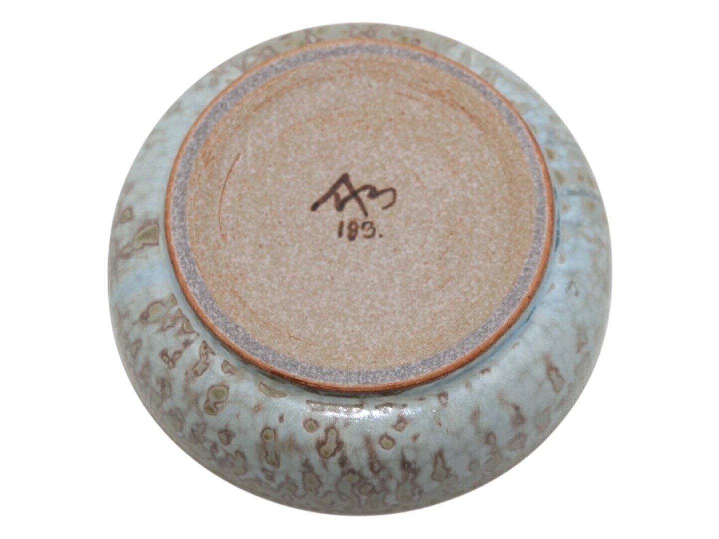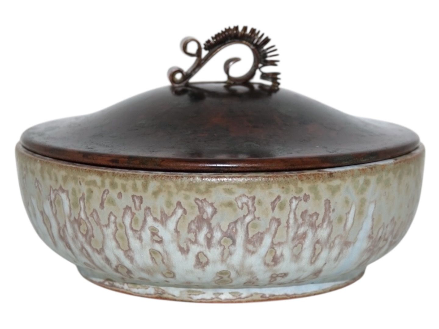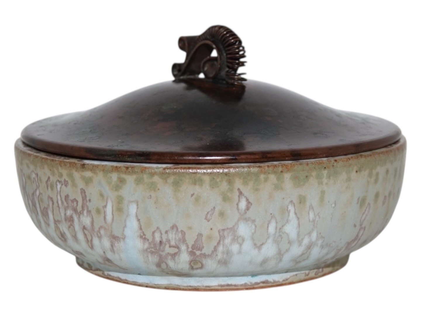 Arne Bang keramik, skål med en flot glasur samt originalt bronzelåg.Design nummer 183.