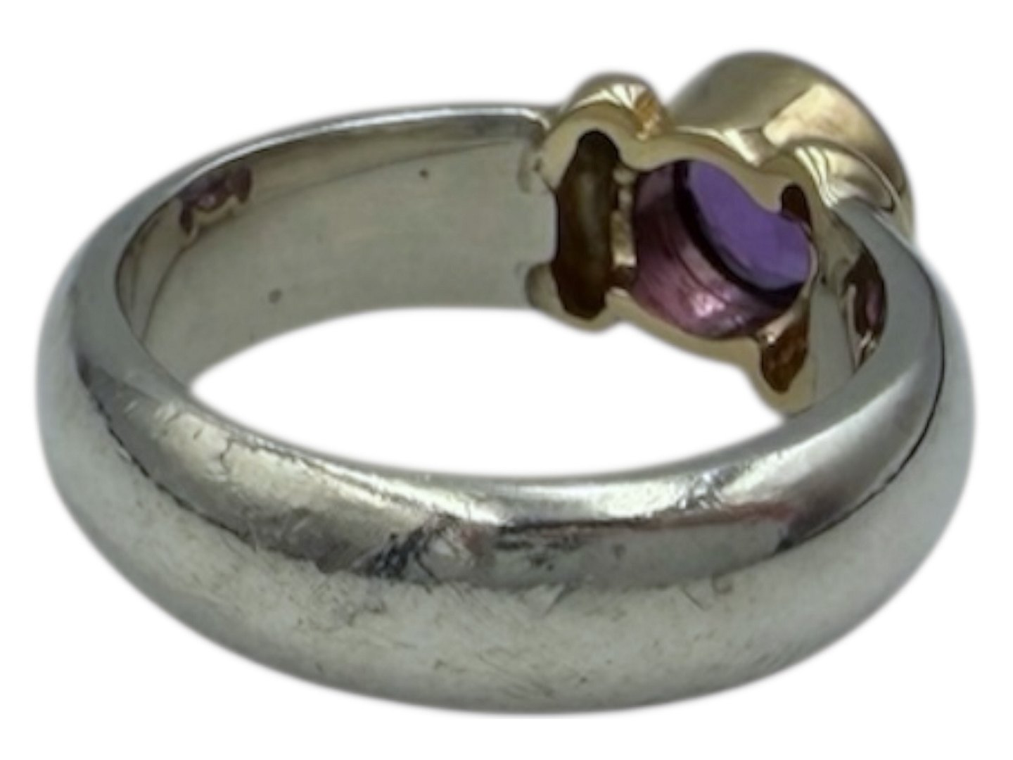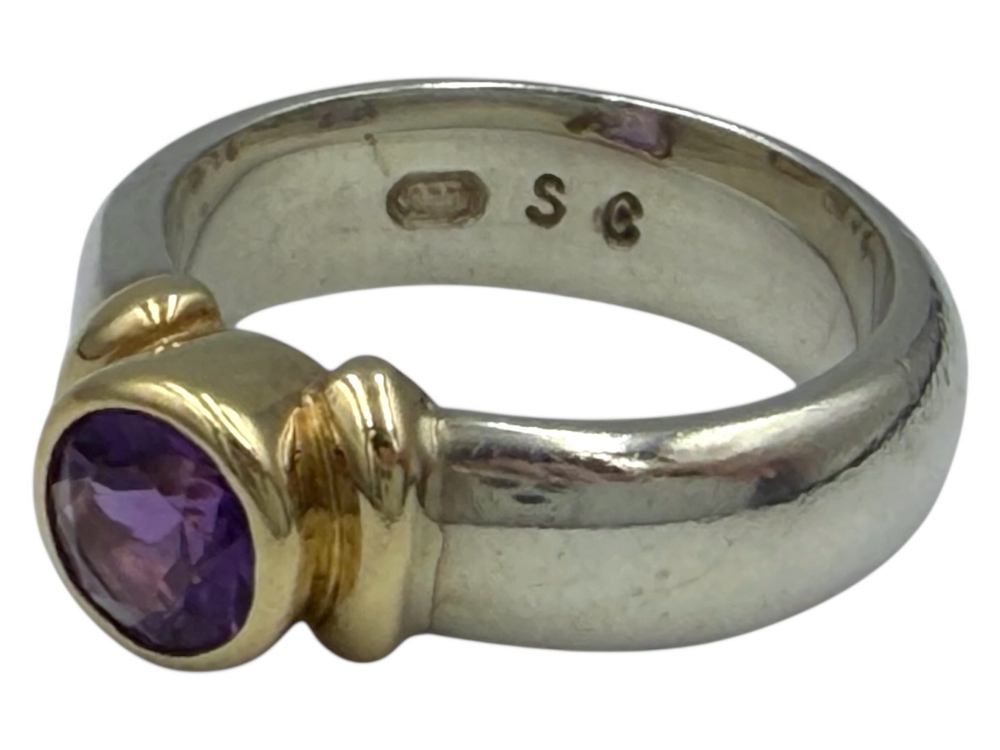 Sterlingsølv og 14 karat guld, ring med lilla sten i kraftig kvalitet.Stemplet "925 S C".