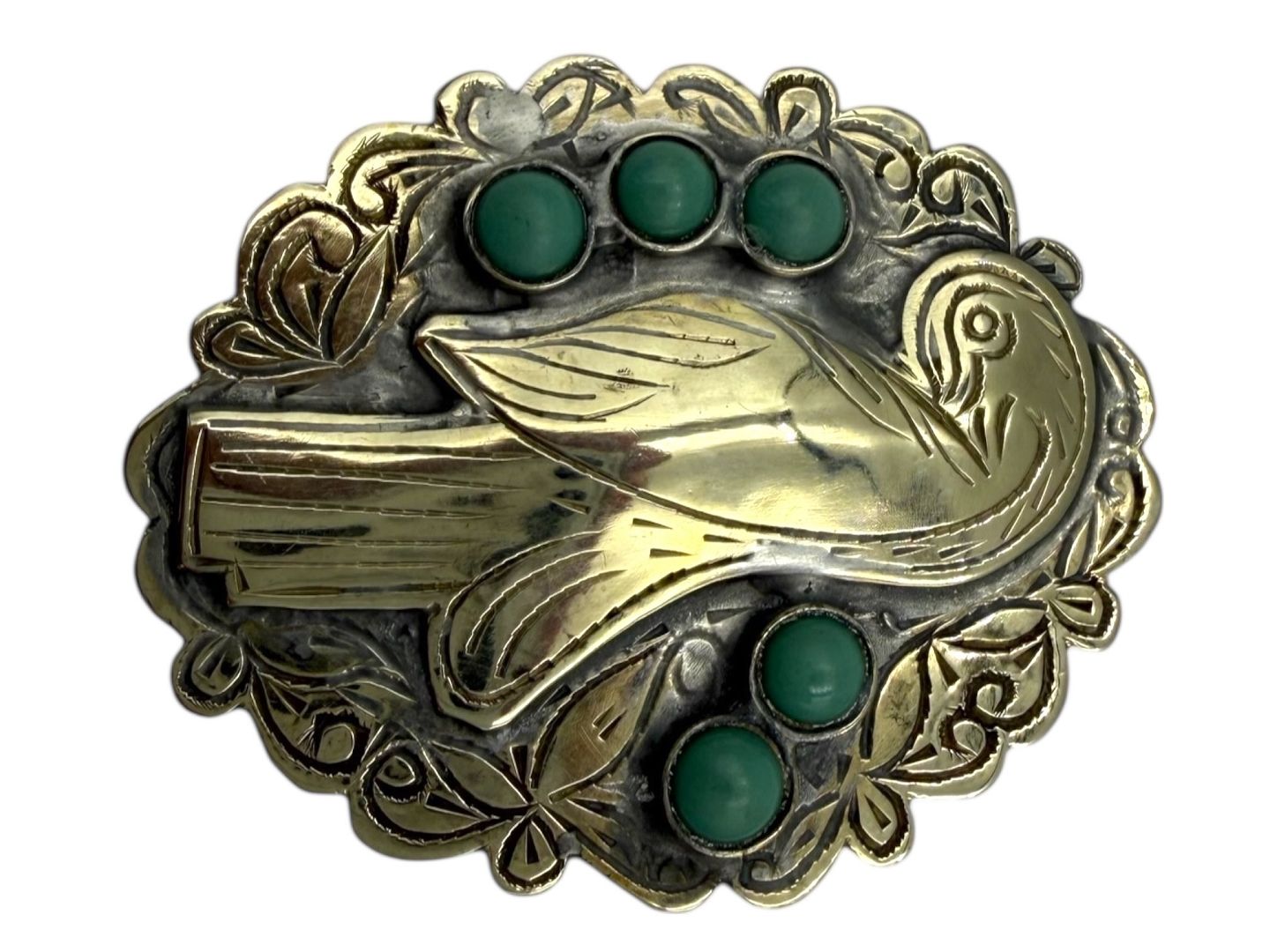 Stor broche med fugl og fem sten.Brochen er ustemplet men det er formentlig sølv.
