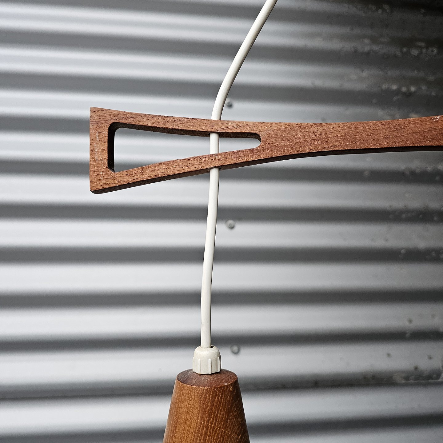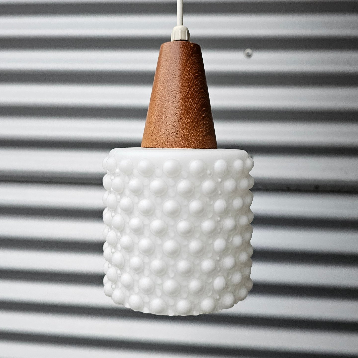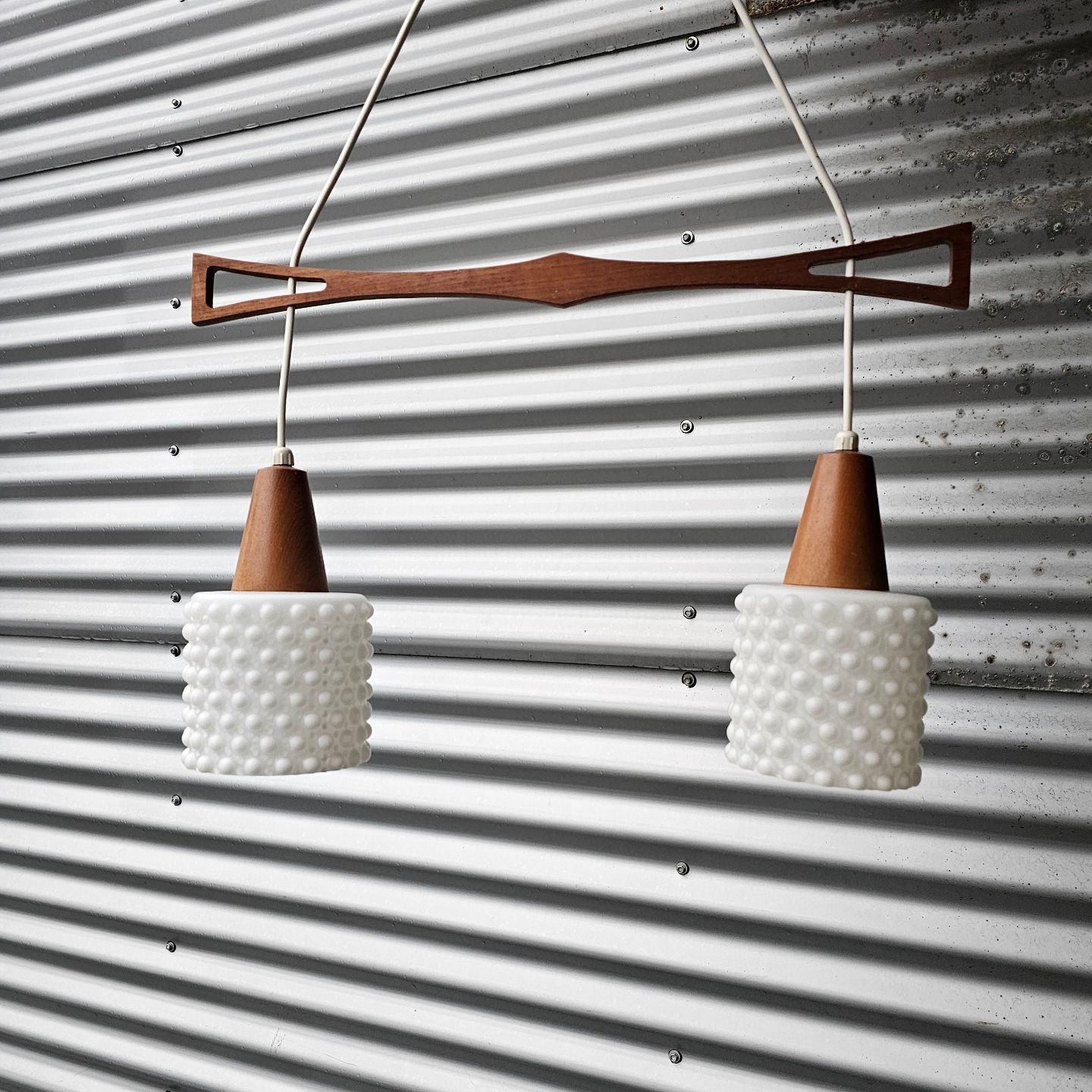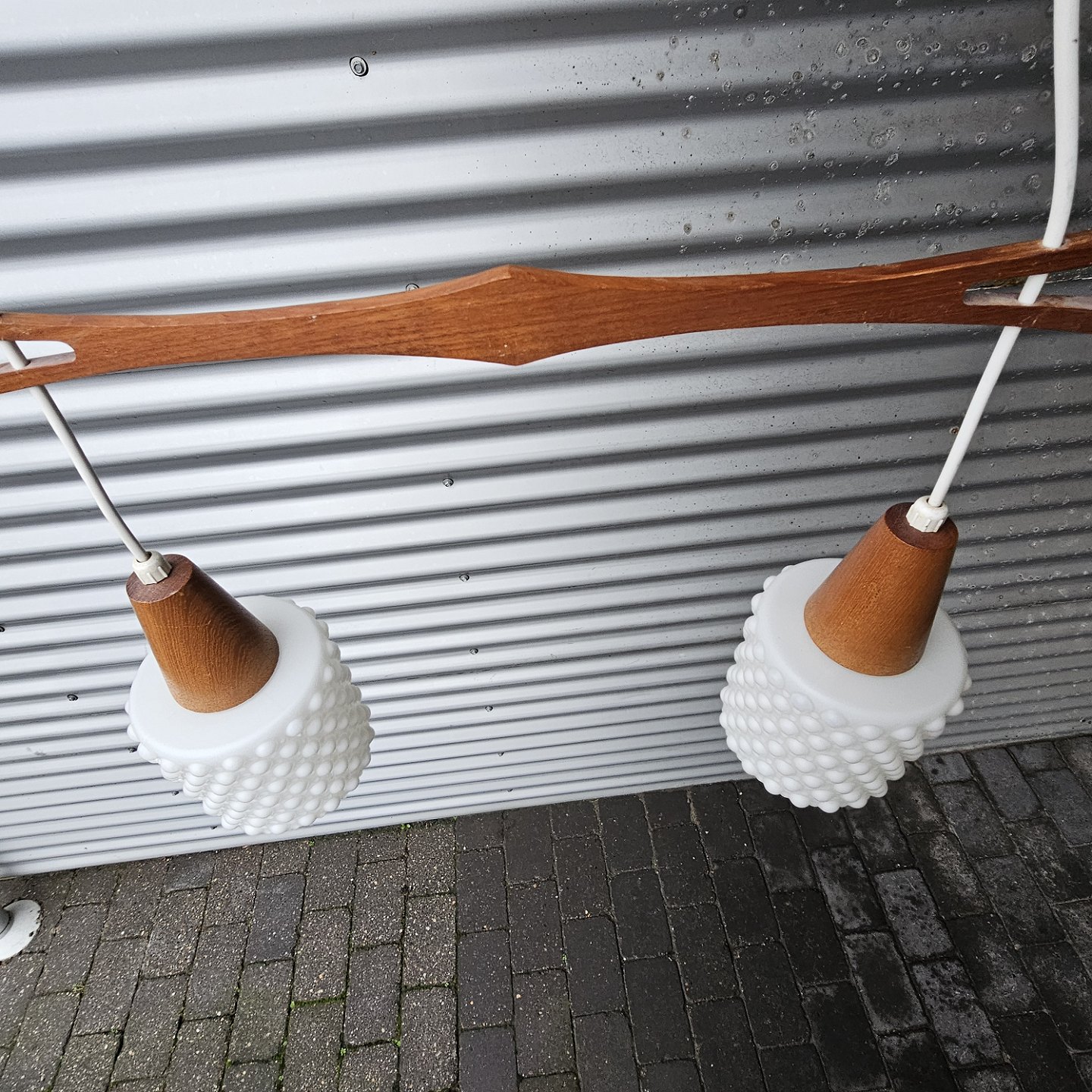 Pendel med ophæng i teak træ og skærme af hvidt opalglasProducent ukendt