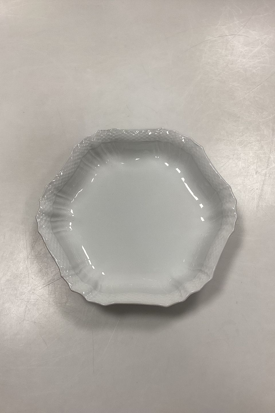 Royal Copenhagen Josephine White Curved Hexagonal Bowl No. 421. Measures 21 cm x 22.5 cm / 8.26 in. x 8.85 in. 2nd Quality with small glaze flaw on underside of rim.Stock: 1