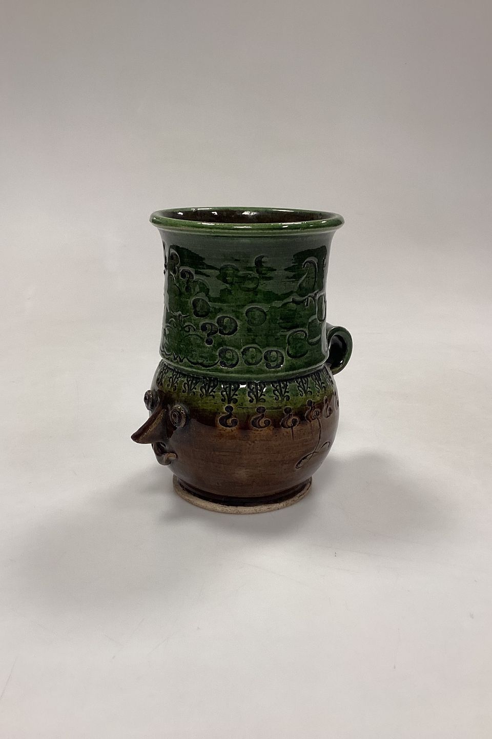 Bjørn Wiinblad Vase i glaseret Stentøj. Motiv med ansigt, hank og prægede stencilmønstre i brun og grøn glasur.Måler 14 cm / 5,51 in.